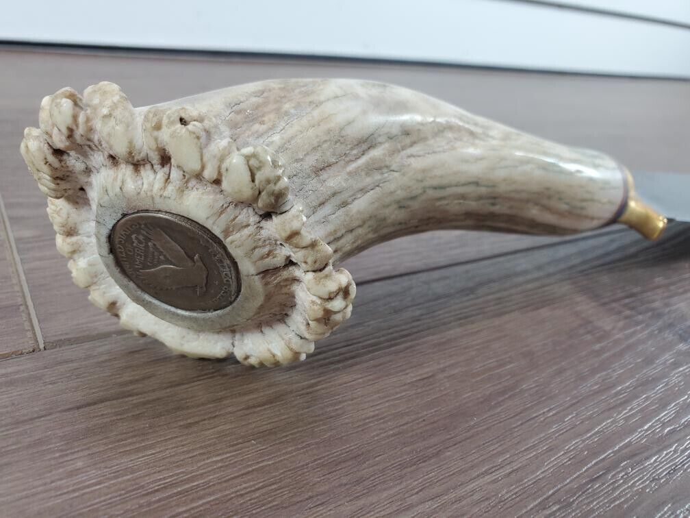 The handle is made from genuine stag horn, complete with a decorative silver quarter inlay, offering a unique aesthetic and a solid grip. With a full tang construction, this knife is built for strength and reliability. It comes with a custom leather sheath for protection and convenient carry.