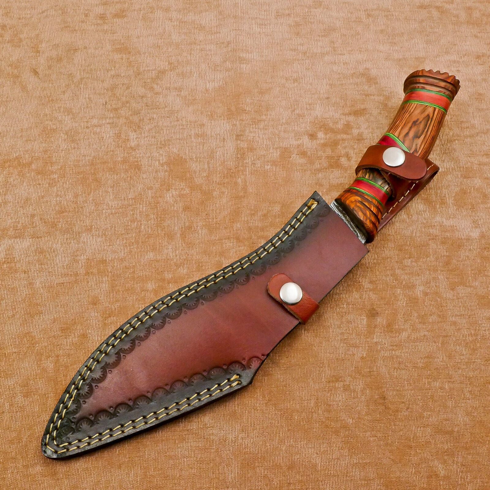 This versatile blade combines the curved edge of a Kukri with the strength and style of a Bowie knife, making it ideal for hunting, camping, outdoor survival, and even combat scenarios. The handle is made from durable Pakka Wood, offering a sleek look and a solid grip in all conditions. Its full tang construction ensures ultimate durability and balance.