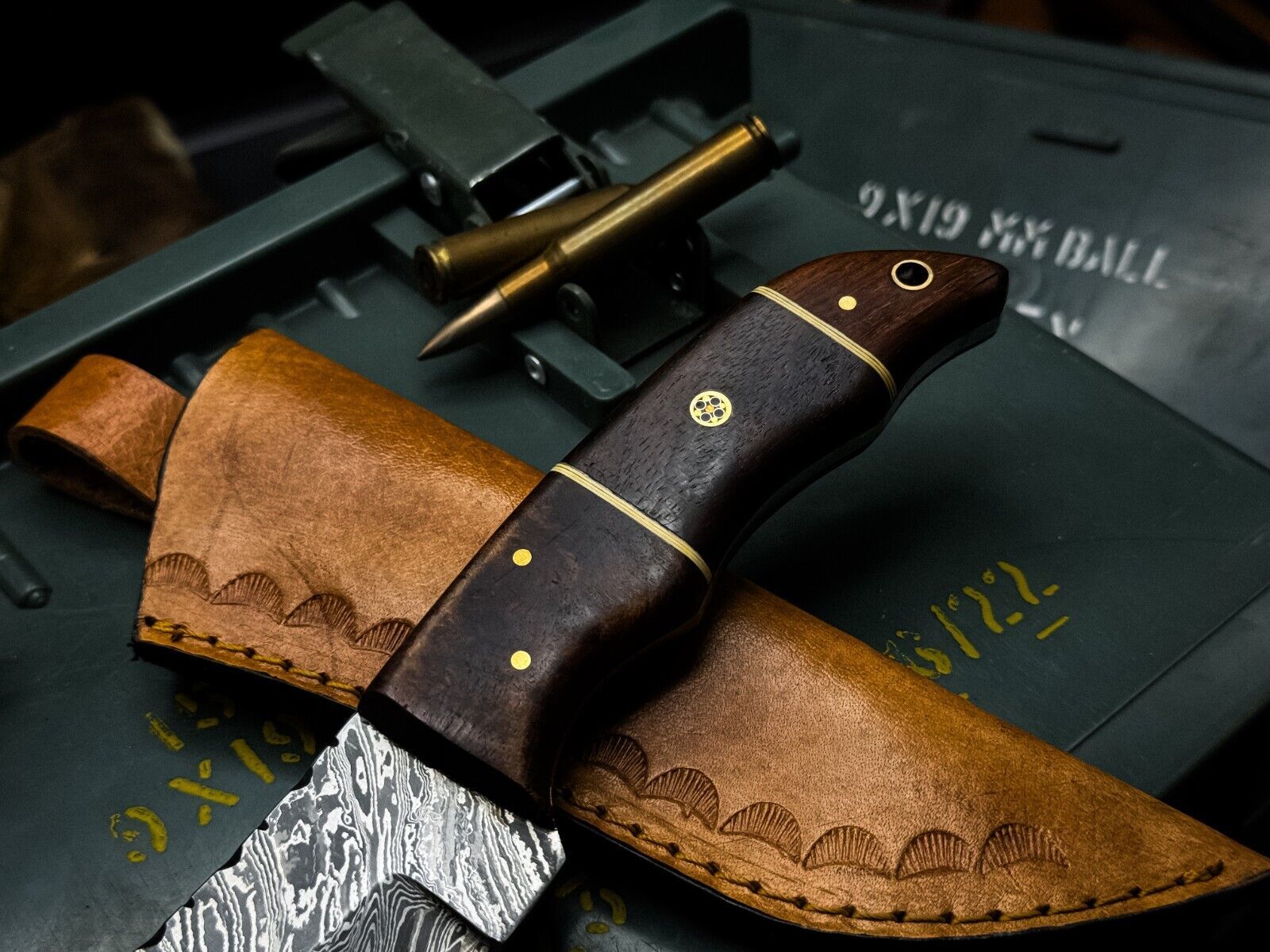 Heritage Forge Handmade Damascus Steel Hunting Knife with Wood Handle and Cow Leather Sheath