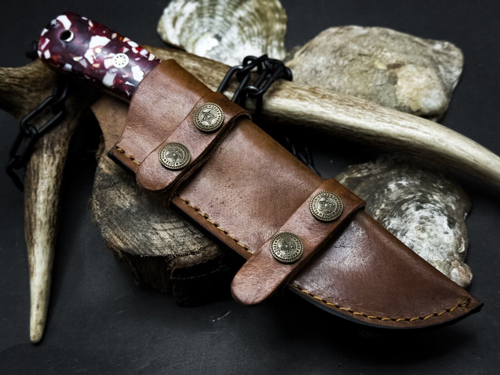 The ergonomic epoxy resin handle ensures a secure and comfortable grip, even in harsh conditions. This knife is designed with ambidextrous dexterity, perfect for both right- and left-handed users. A high-quality leather sheath is included for safe storage and easy portability.