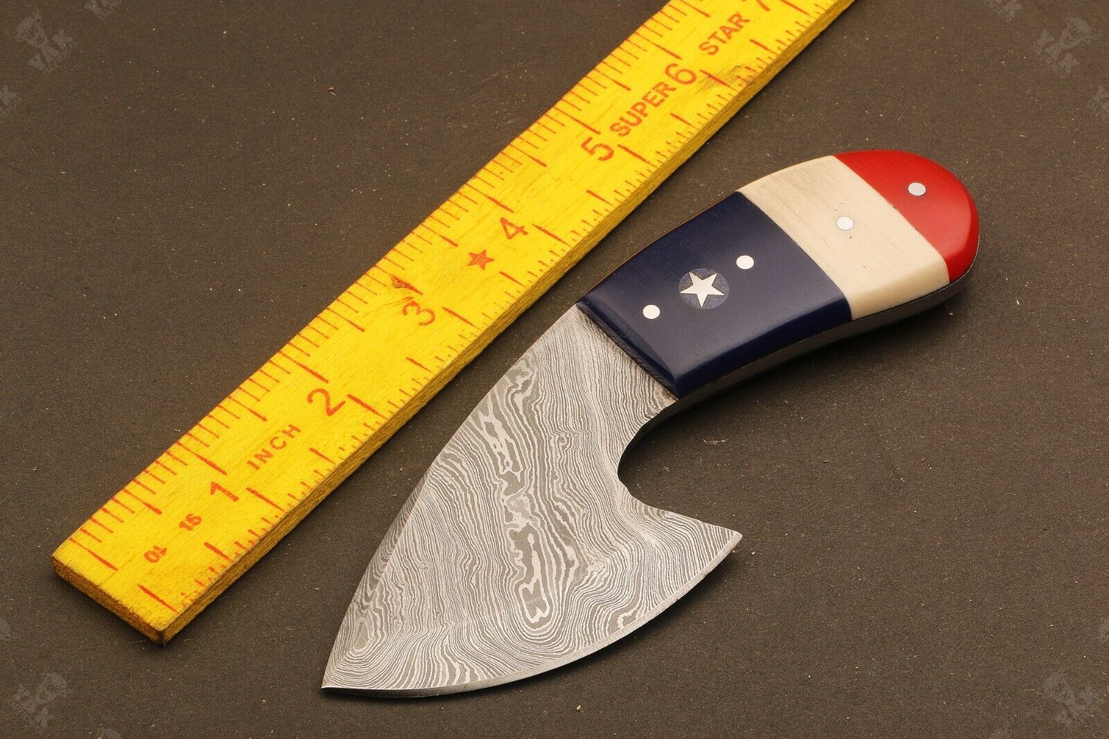 The handle is a stunning combination of stained camel bone and natural wood, accented with brass spacers and a hand-forged Damascus steel bolster. This unique blend of natural and forged materials provides both aesthetic charm and a solid, ergonomic grip for field use or display.