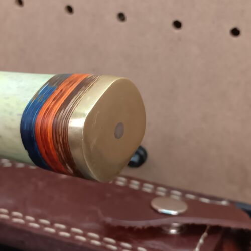 The knife is in used condition, showing normal signs of wear such as surface scratches, scuffs, and marks on both the blade and handle. While the exact handle material is epoxy resin, it offers a solid grip and remains fully functional for field use. The blade is full tang, ensuring durability and balance. A leather sheath is included for safe storage and transport.