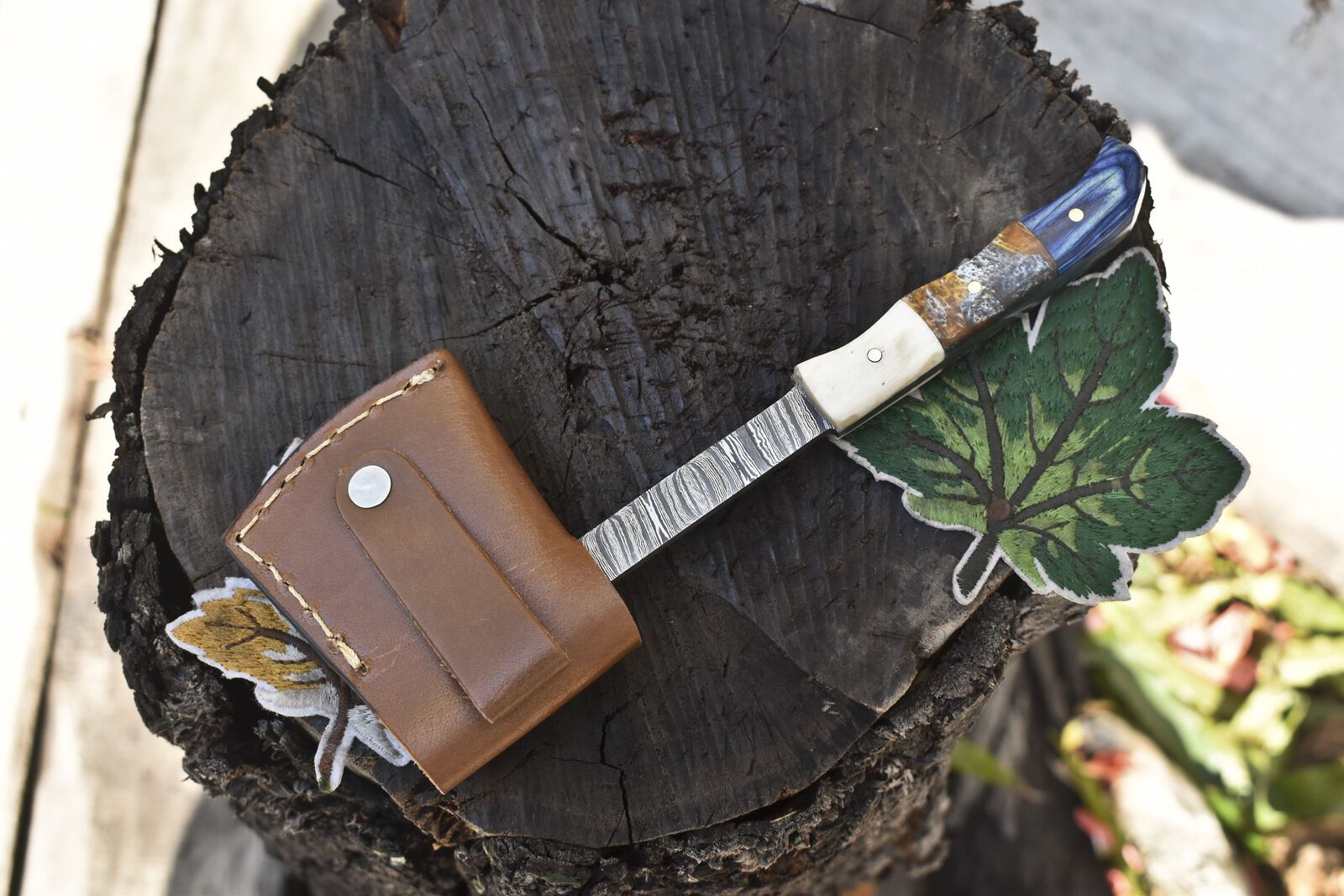 The handle is crafted from a blend of mixed materials, chosen to balance comfort, grip, and durability. Despite its smaller 7.5-inch size, this axe knife offers impressive performance, making it ideal for everyday carry, camping, and outdoor use. Its balanced weight and sharp Damascus edge ensure versatility, whether for chopping, cutting, or collecting.