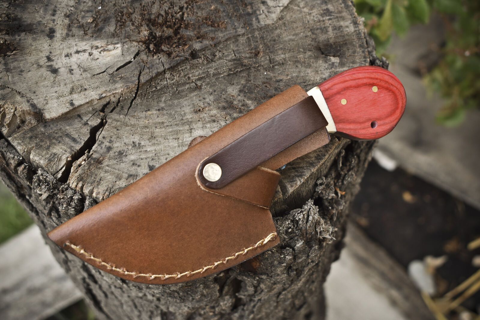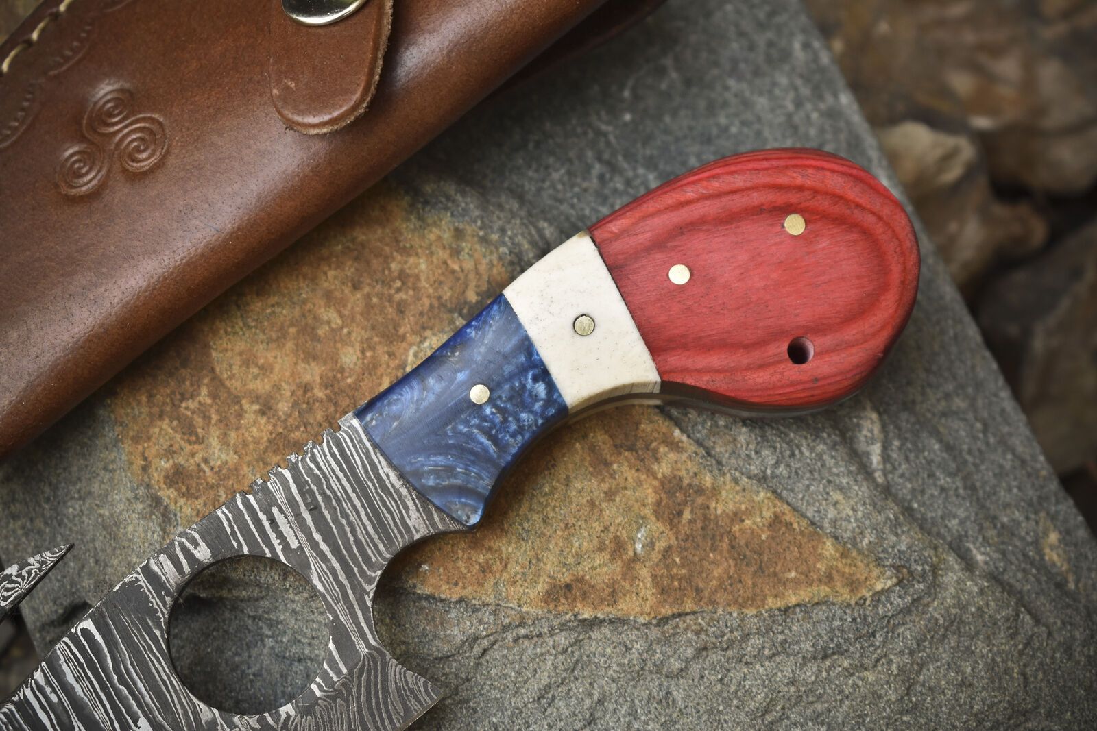 This damascus skinner knife features a 7.0-inch overall length with a 4.0-inch blade and a 3.0-inch handle crafted from a beautiful combination of bone and wood. The blade is made from high-quality Damascus steel, a blend of 1095 and 15N20 steels folded repeatedly to create a strong, durable, and visually striking knife. The twist pattern on the blade displays dynamic swirling lines in deep blacks and bright silvers, adding a unique, modern, and timeless look. Designed specifically for hunters and outdoor enthusiasts, this knife includes a precise gut hook that offers a safe and controlled method for field dressing game such as deer or elk. The blade is oil tempered to 58-60 HRC, ensuring excellent hardness and edge retention. The micarta bolster adds strength and balance to the handle while enhancing its rugged appeal. This knife comes with a thick, hand-tooled leather sheath built to withstand tough use. Proper care involves sharpening at a 20-degree angle with a diamond wet stone, cleaning with soap and water, drying completely, and applying gun oil before storage away from the sheath to prevent rust. Each knife is 100% handmade, making every piece unique and perfect as a collectible or gift.