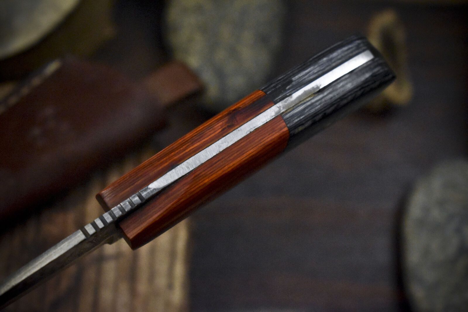 This Hot Item Skinner Knife is expertly crafted for hunters and anglers, featuring a precision forged blade made of layered 1095 and 15N20 Damascus steel. The blade is oil tempered to 58-60 HRC for superior hardness and edge retention. Its unique ladder Damascus pattern presents sharp, polished bands resembling a ladder, giving the blade a refined and striking appearance. Equipped with a gut hook, this knife allows for safe and controlled field dressing, ideal for fish and game like deer or elk. The handle is made from durable hard wood, providing a solid grip and natural beauty. Measuring 7.5 inches overall with a 3.5-inch blade, this compact yet powerful tool is perfect for fishing, hunting, and outdoor skinning tasks. The knife includes a thick, hand-tooled leather sheath designed to withstand rough use and protect the blade. Every knife is 100% handmade without CNC or precut blanks, ensuring each piece is unique with distinct handcrafted qualities. Reliable, stylish, and functional, this skinning knife is a must-have for outdoor enthusiasts.