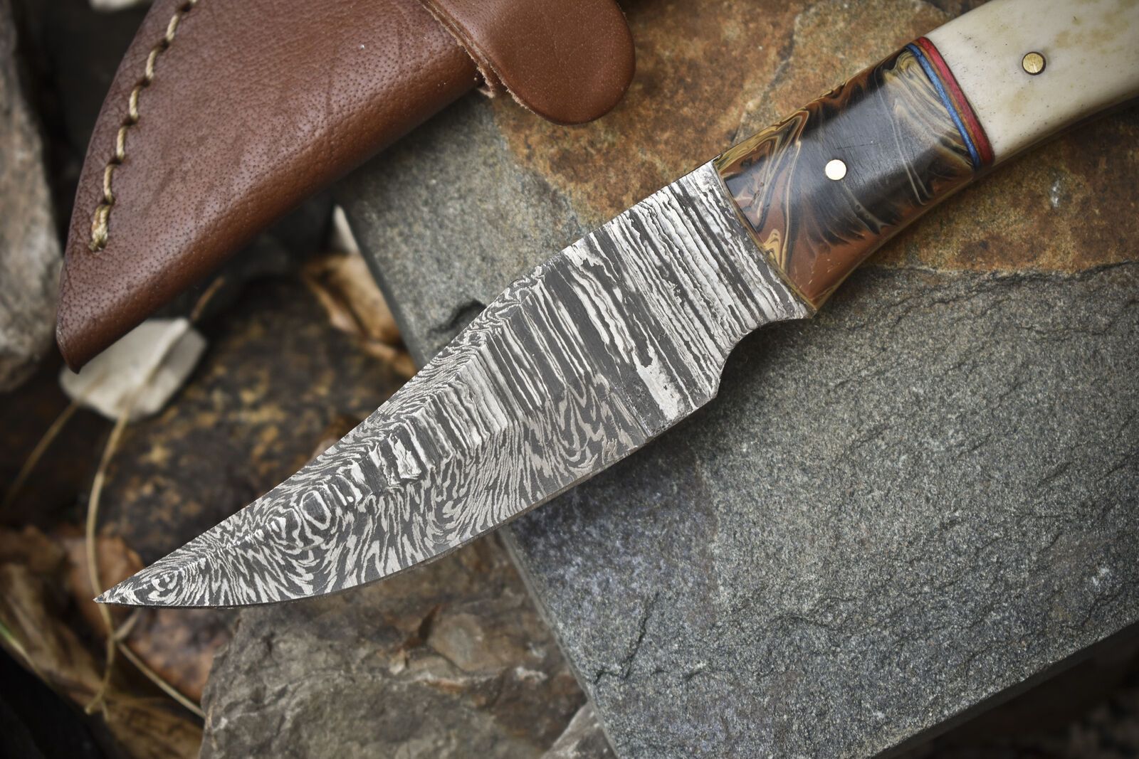 This damascus skinner knife features an overall length of approximately 8.0 inches, with a 4.0-inch blade and a 4.0-inch polished bone handle that ensures a comfortable grip for precise control during outdoor activities. The blade is made from a blend of 1095 and 15N20 steel, folded repeatedly to create the stunning twist Damascus pattern, acid-etched to highlight rich contrasts of black and silver layers. Oil tempered to 58-60 HRC, this blade offers excellent edge retention and durability ideal for skinning and hiking tasks. The knife includes a sturdy micarta bolster that adds balance and protects your hand. The package comes with a thick, hand-tooled leather sheath designed for rugged use and longevity. Every knife is 100% handmade, free from CNC machining or precut blanks, ensuring a unique character in every piece. This handmade skinner Damascus knife is perfect for hunters, hikers, and collectors seeking exceptional quality combined with beautiful craftsmanship.