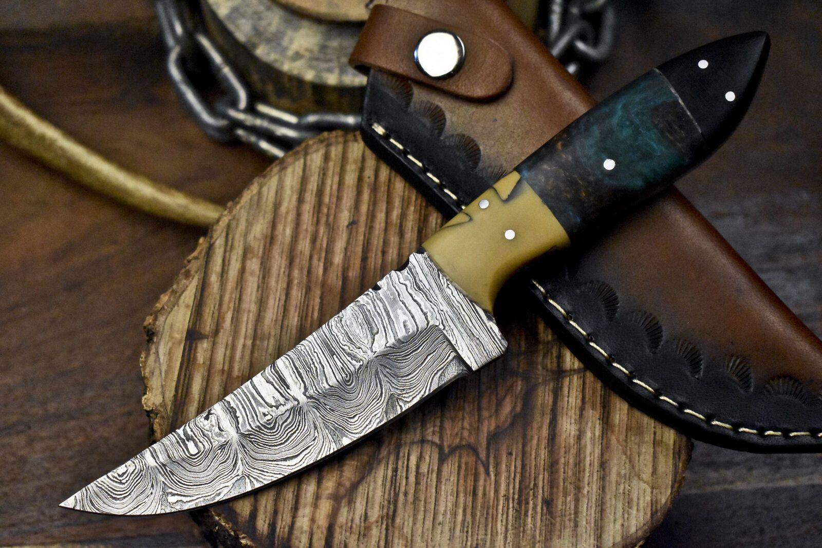 This hot item skinner knife is crafted for serious outdoor use and hunting performance. The 9.0-inch overall length includes a precision-forged 5.0-inch twist pattern Damascus steel blade made by folding 1095 and 15N20 high carbon steels into over 200 layers, then acid-etched for bold contrast. This results in a strong, oil-tempered blade rated at 58–60 HRC hardness for maximum edge retention and durability. The Corian handle is water-resistant and built for long-term use, while the micarta bolster adds structural integrity and a premium touch. Ideal for hunters, this wide, rigid Damascus skinner knife ensures clean, efficient skinning with complete control. The stunning twist pattern adds visual depth with its mix of dark shadows and shining silvers, creating a look as fierce as its function. Perfectly balanced and handmade to exacting standards, this custom handmade fixed blade hunting knife skinner includes a hand-stitched leather sheath for rugged field carry. Whether you’re processing game or collecting heirloom blades, this Damascus acid etched fixed skinner knife with Corian and micarta is a striking and reliable companion.
