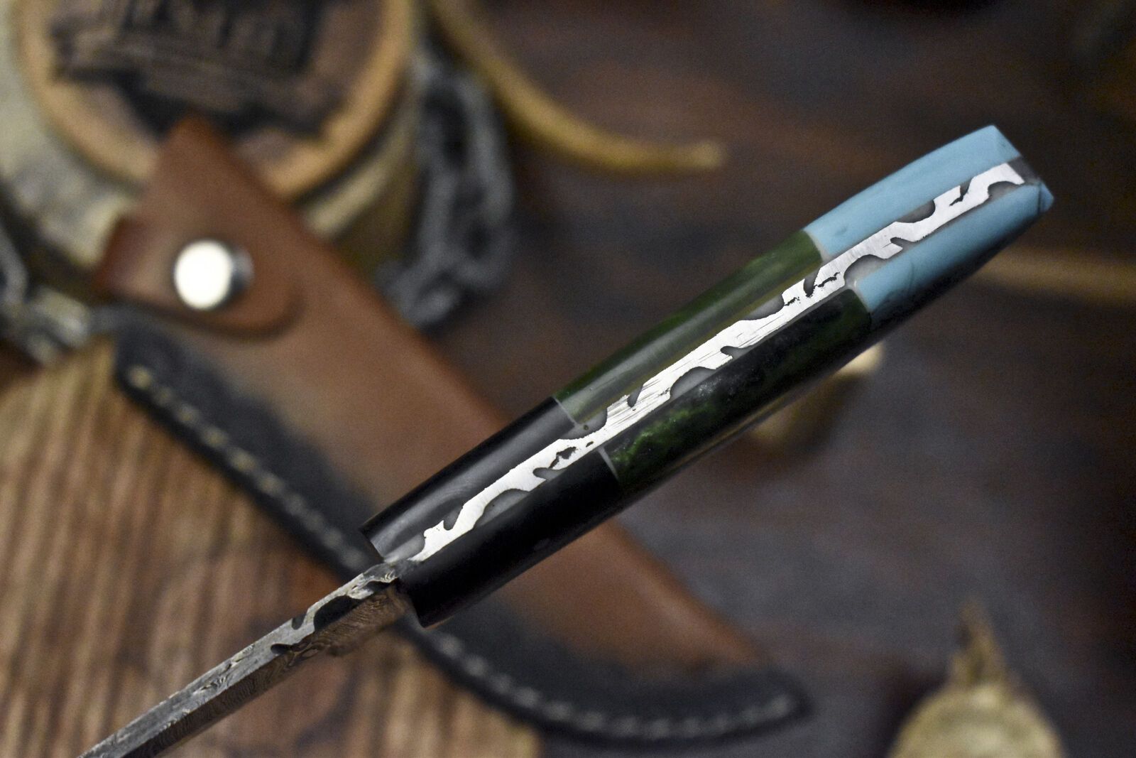 Includes a premium hand-tooled leather sheath for protection and carry. This damascus acid etched fixed skinner knife is a must-have for serious knife users and enthusiasts alike.