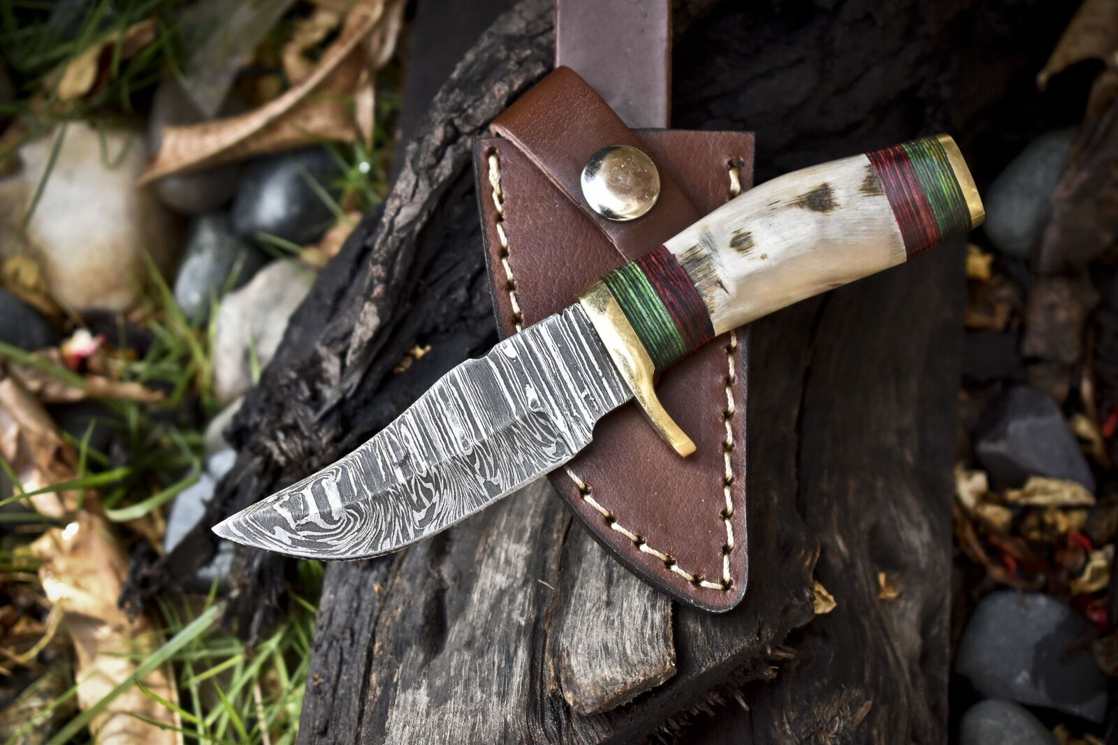 The 3-inch handle is made from naturally shed stag antler, offering a rugged, organic grip and distinctive rustic appearance. A solid brass guard enhances both control and style, while the compact blade makes it ideal for field dressing, skinning, and precision outdoor tasks. This damascus knife custom handmade fixed blade hunting knife skinner is lightweight, easy to carry, and perfect for hikers, campers, and hunters seeking a blend of tradition and performance.