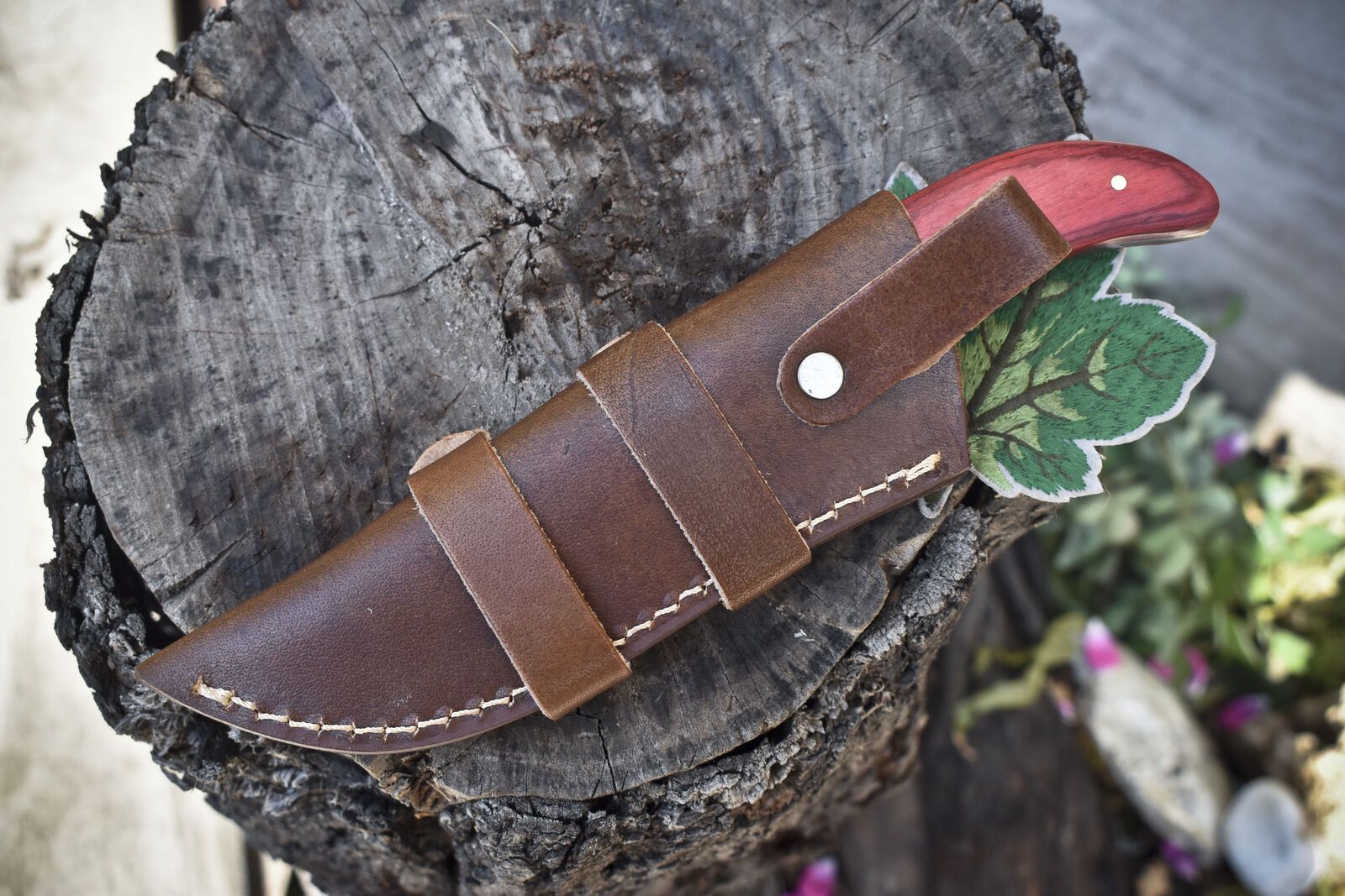 Its handle is shaped from strong hardwood, offering a secure and comfortable hold. Each knife includes a hand-sewn leather sheath for protection and portability. Whether you're collecting, gifting, or using it in the wild, this Damascus skinner hunting knife delivers exceptional performance. If you're searching for a Damascus skinner knife for sale, this ladder-patterned blade is a standout piece of functional art.