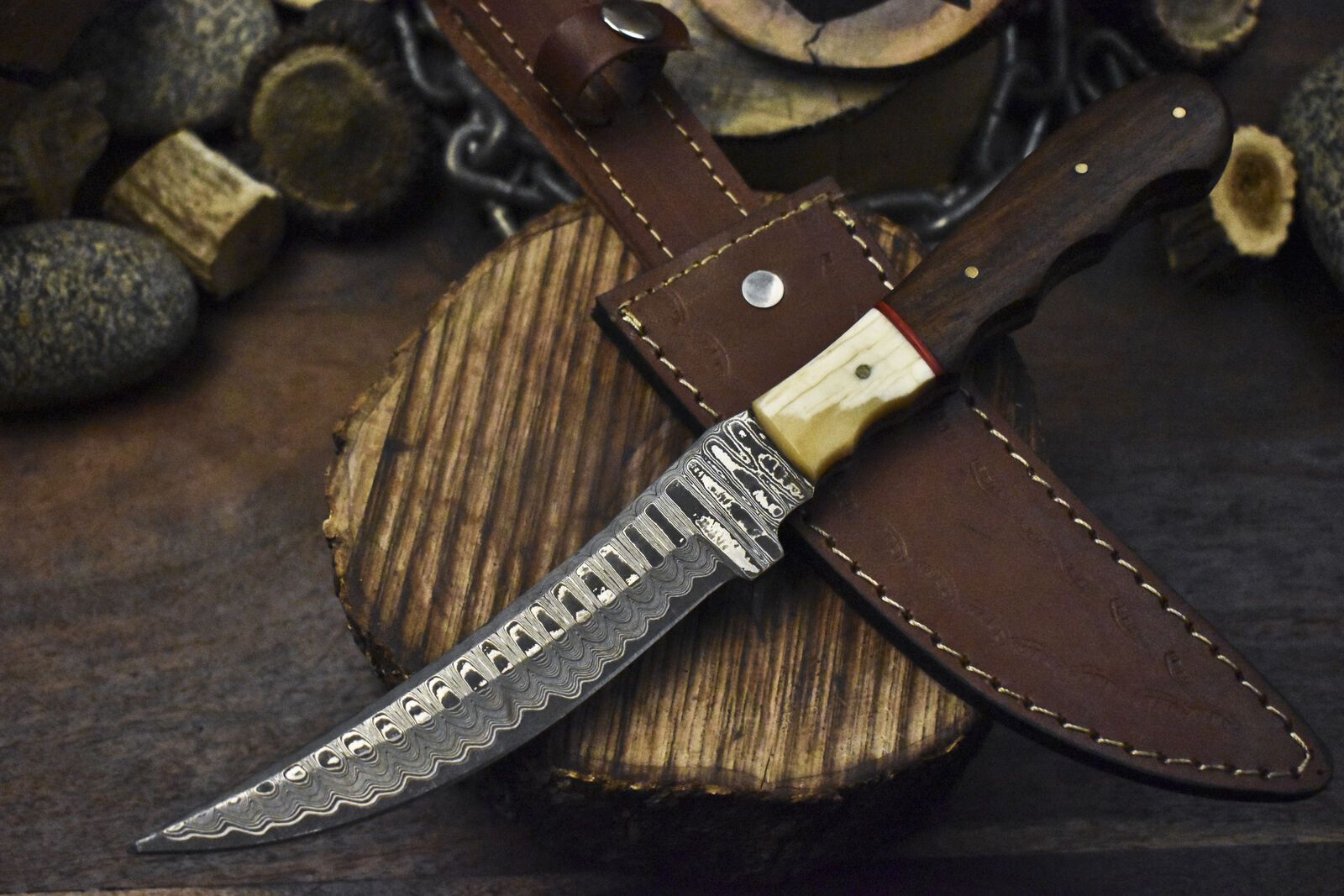 Ladder Damascus Skinner Knife with Walnut Wood Handle | Handmade EDC Fixed Blade Hunting Knife