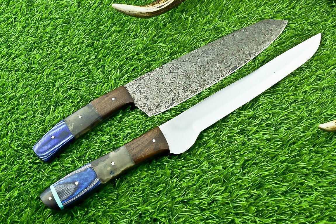 Lot of 2 Handmade Damascus & D2 Steel Chef Knives | Forged Kitchen Knife Set