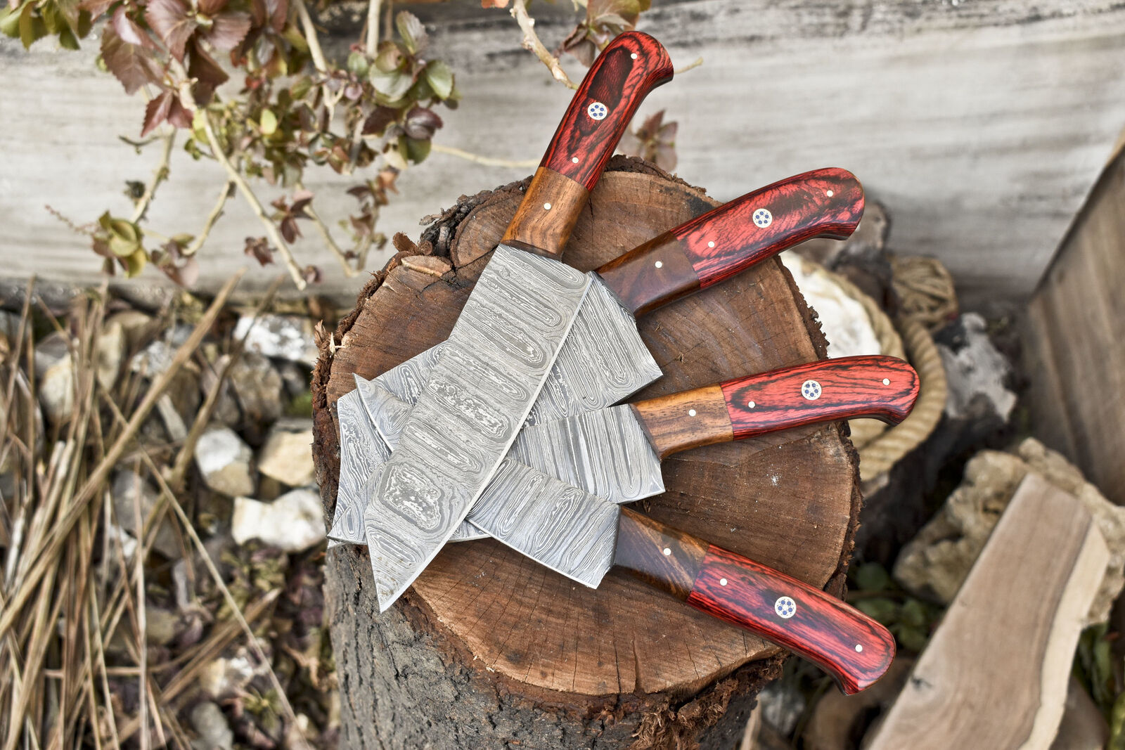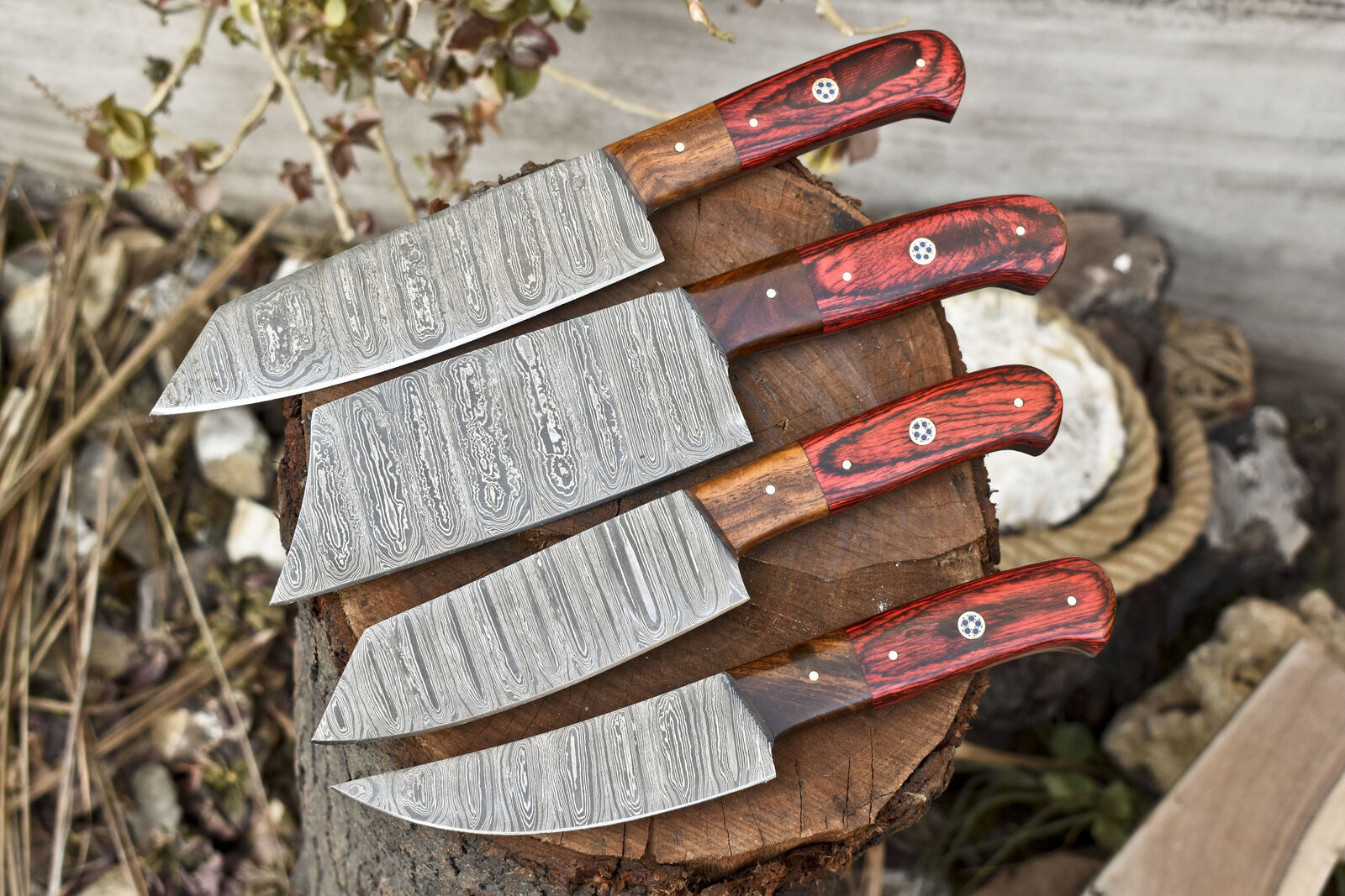 Lot of 4 Handmade Damascus Chef Knives – 12" Hand Forged Kitchen Knife with Hardwood Handle & Leather Sheath