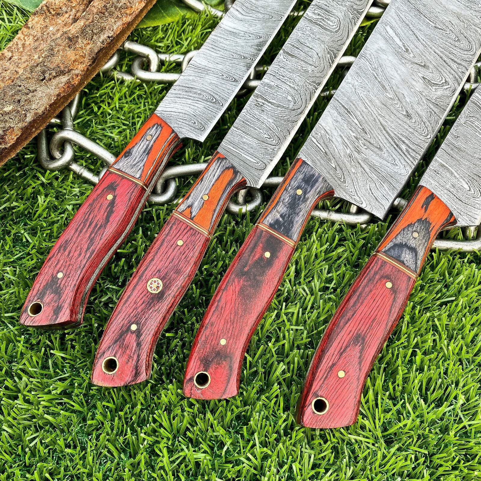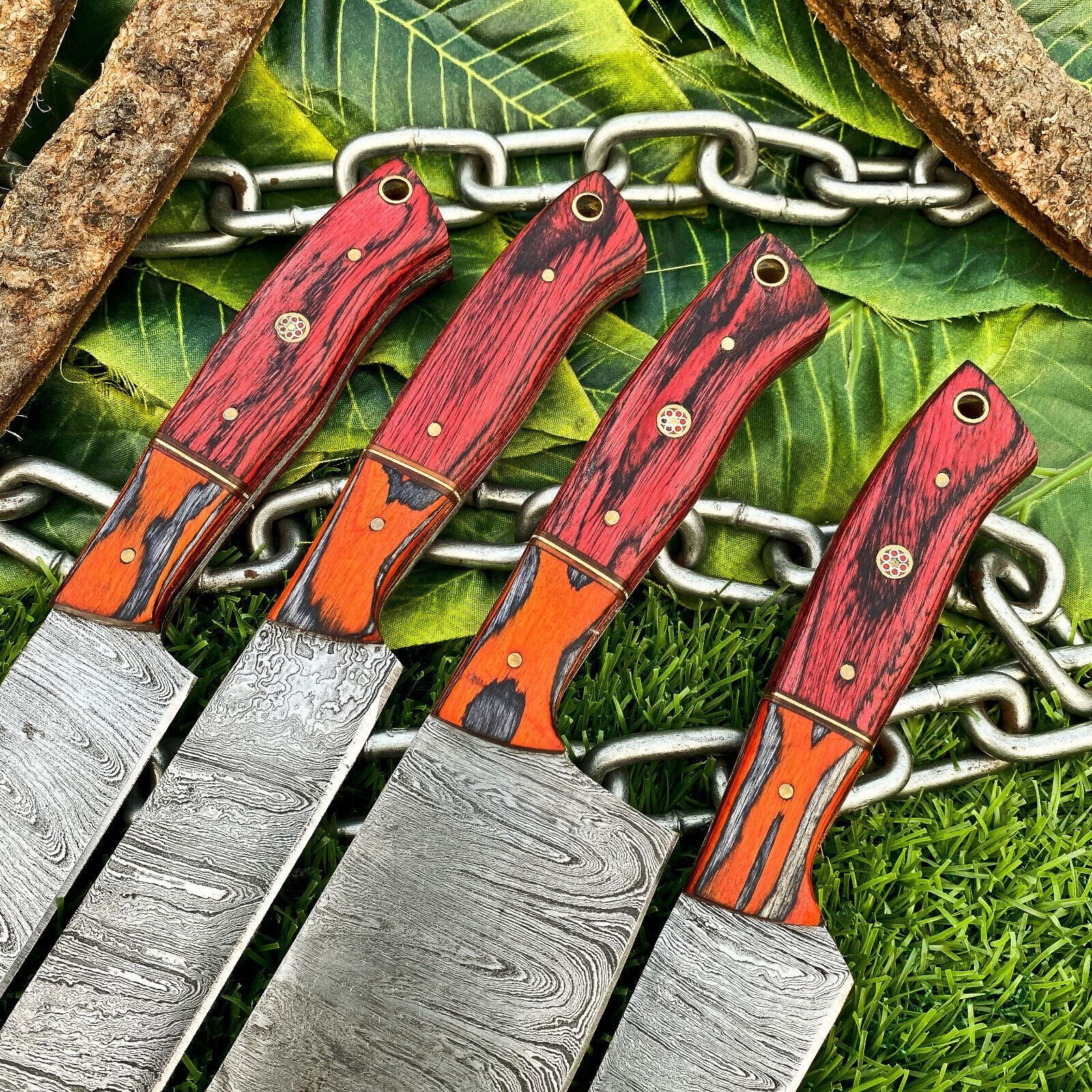 Lot of 4 Handmade Damascus Steel Chef Knife Set – Full Tang Kitchen Knives with Hardwood Handles