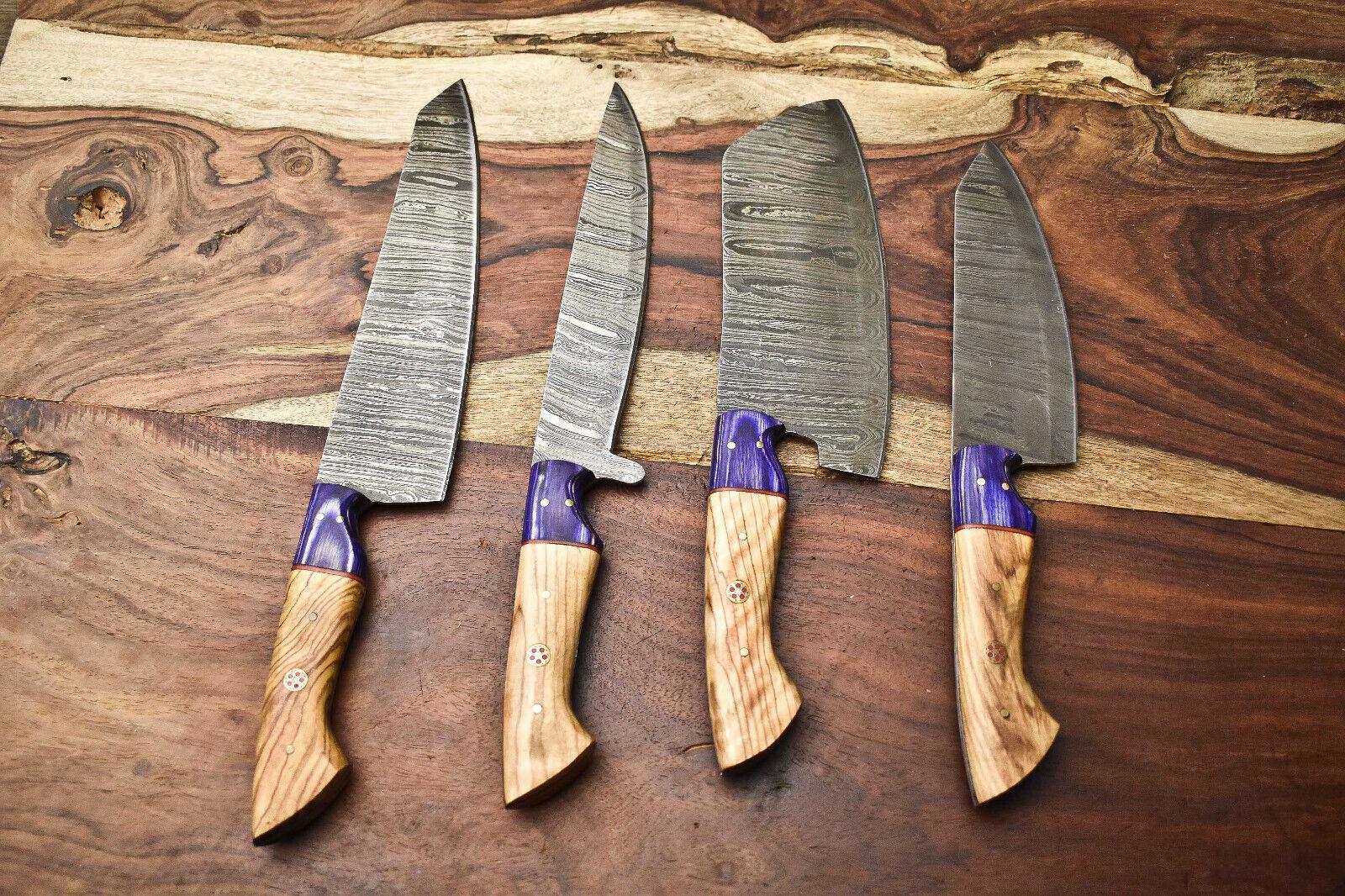 Lot Of 4 Handmade Damascus Steel Full Tang Chef Knife Set – Custom Kitchen Knives