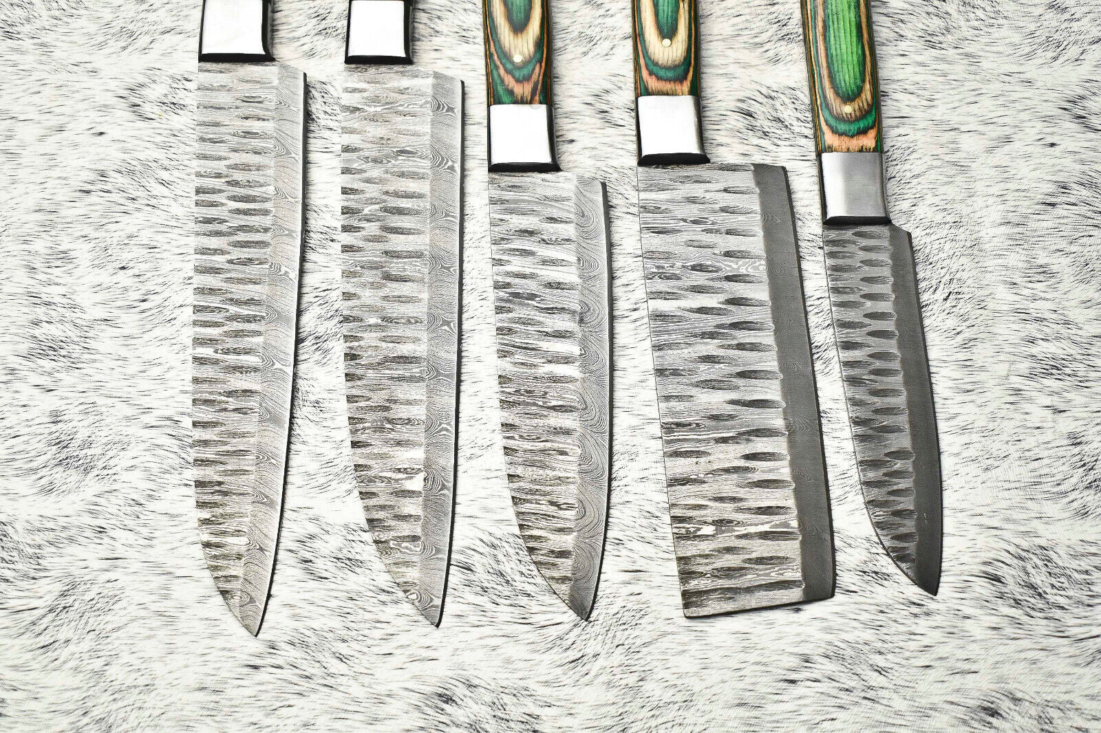 Lot of 5 Handmade Damascus Hammered Chef Knives – Full Tang with Hardwood Handles