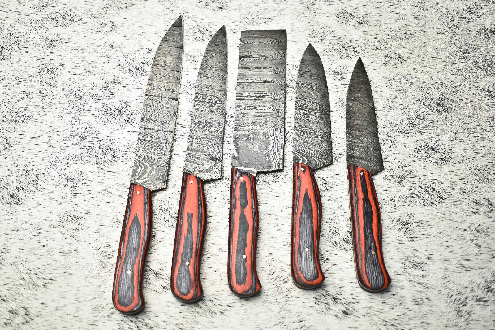 Lot of 5 Handmade Damascus Hammered Full Tang Chef Knives – Hardwood Set