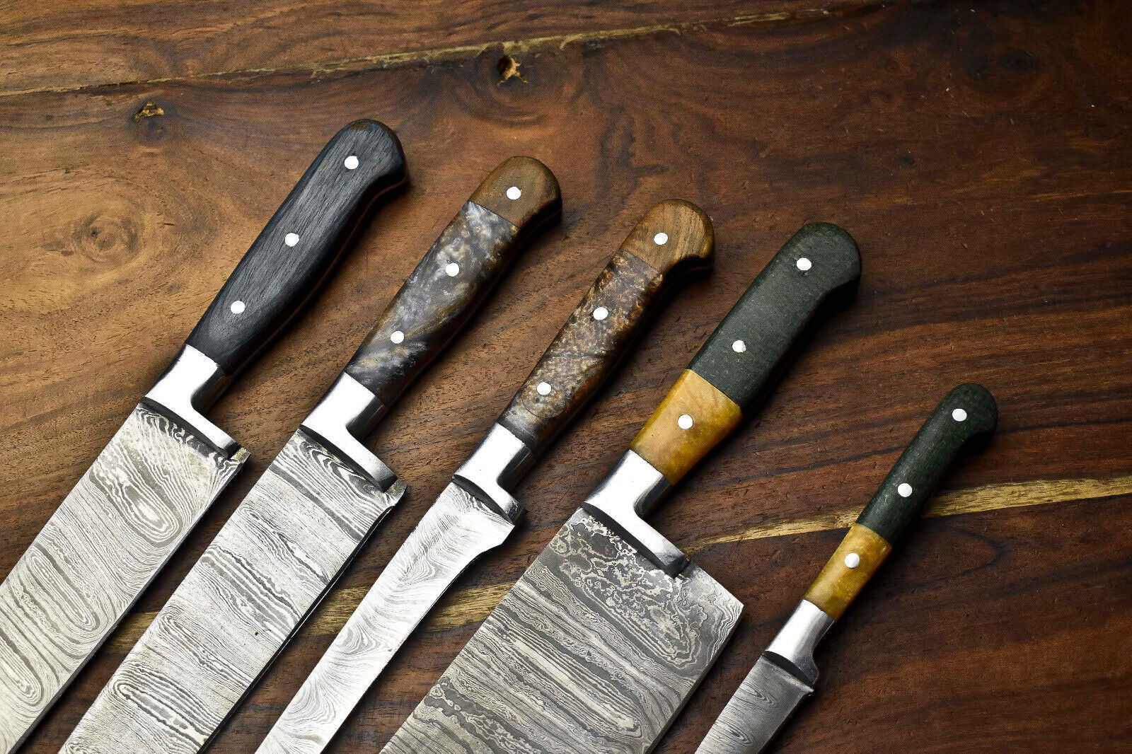 Lot of 5 Handmade Hammered Damascus Steel Blade Chef Knives – 10" to 13" Professional Kitchen Set