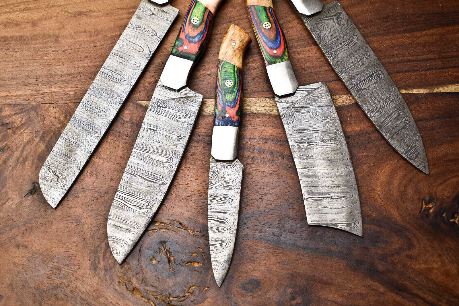 Lot of 5 Handmade Hammered Damascus Steel Chef Knives – 384 Layers, Full Tang, 58–60 HRC