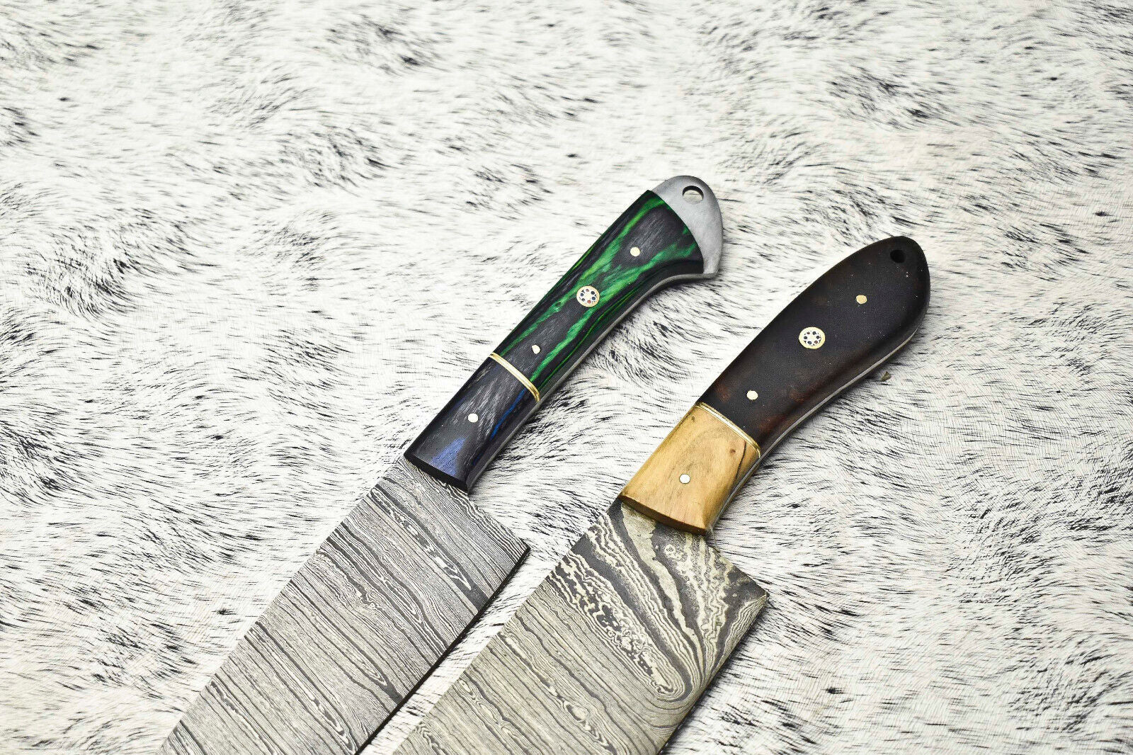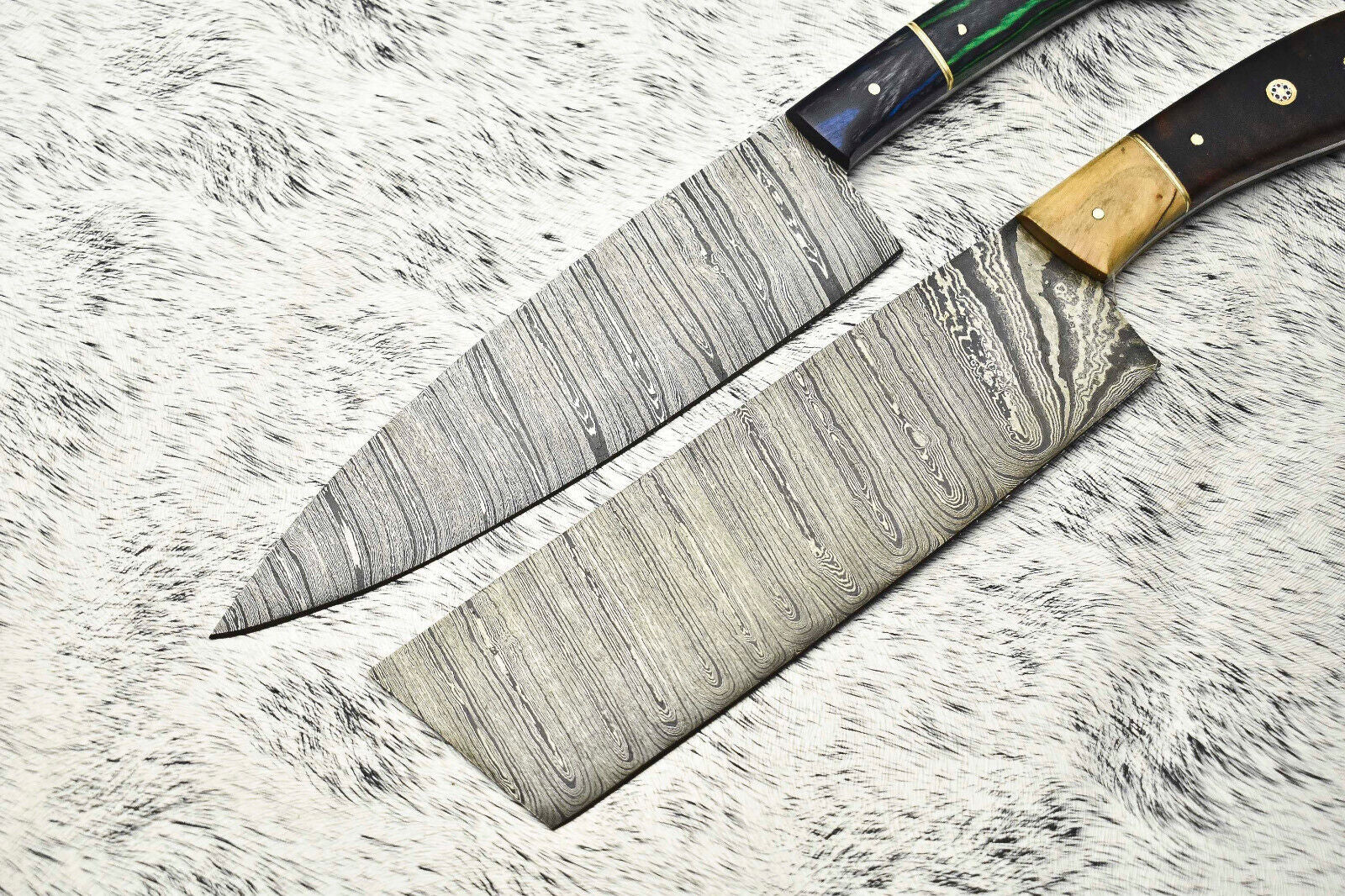 This Handmade Damascus Steel Blade Chef Set features expertly crafted knives, each made from authentic Damascus steel. Our Damascus is created using a blend of 1095HC and 15N20 nickel carbon steel, heated and folded repeatedly to form 384 distinctive layers. The blades are then acid-etched, revealing the elegant contrast between the satin-colored nickel and dark high-carbon steel. After forging, each handle is meticulously polished, and the blade edges are sharpened to perfection. Every knife is 100% handmade, ensuring unique characteristics and superior quality without any CNC machining. This set is ideal for professional chefs, home cooking enthusiasts, and knife collectors alike.