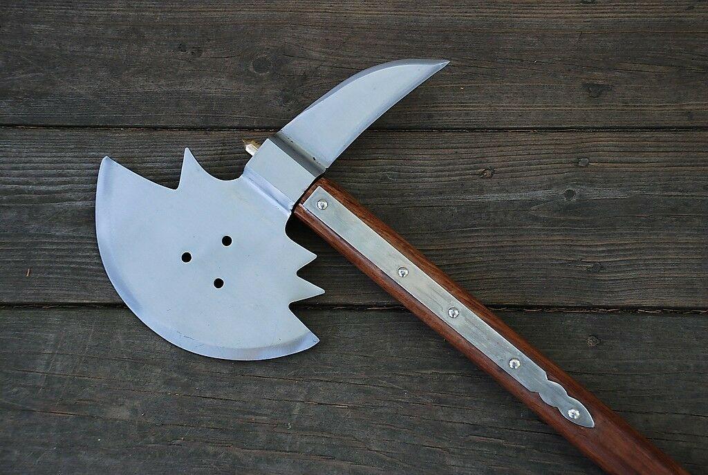 Bring the might of Norse warriors into your collection with this Medieval Viking Barbarian Battle Broad Axe. Expertly crafted as a replica, this axe combines the imposing design of historical Viking weaponry with a practical, collectible form. Measuring 31 inches in overall length, with a 10-inch axe head, and weighing just under 3 lbs, it’s the perfect balance of visual impact and manageable size.The solid wood handle provides durability and authenticity, while the unsharpened carbon steel blade ensures safe handling, making this axe ideal for cosplay, display, theatrical performances, or as a centerpiece in your collection. Though not intended for cutting, chopping, or combat, it faithfully reproduces the aesthetic and feel of a Viking battle axe, complete with a broad, menacing blade and robust construction.This replica axe is a great gift for collectors, history enthusiasts, or fans of medieval and Viking culture. Its impressive size, detailed craftsmanship, and affordable price make it an excellent addition to any display. Whether mounted on a wall, used in reenactments, or admired as part of a weapon collection, this Viking broad axe captures the spirit of the legendary warriors of the North.