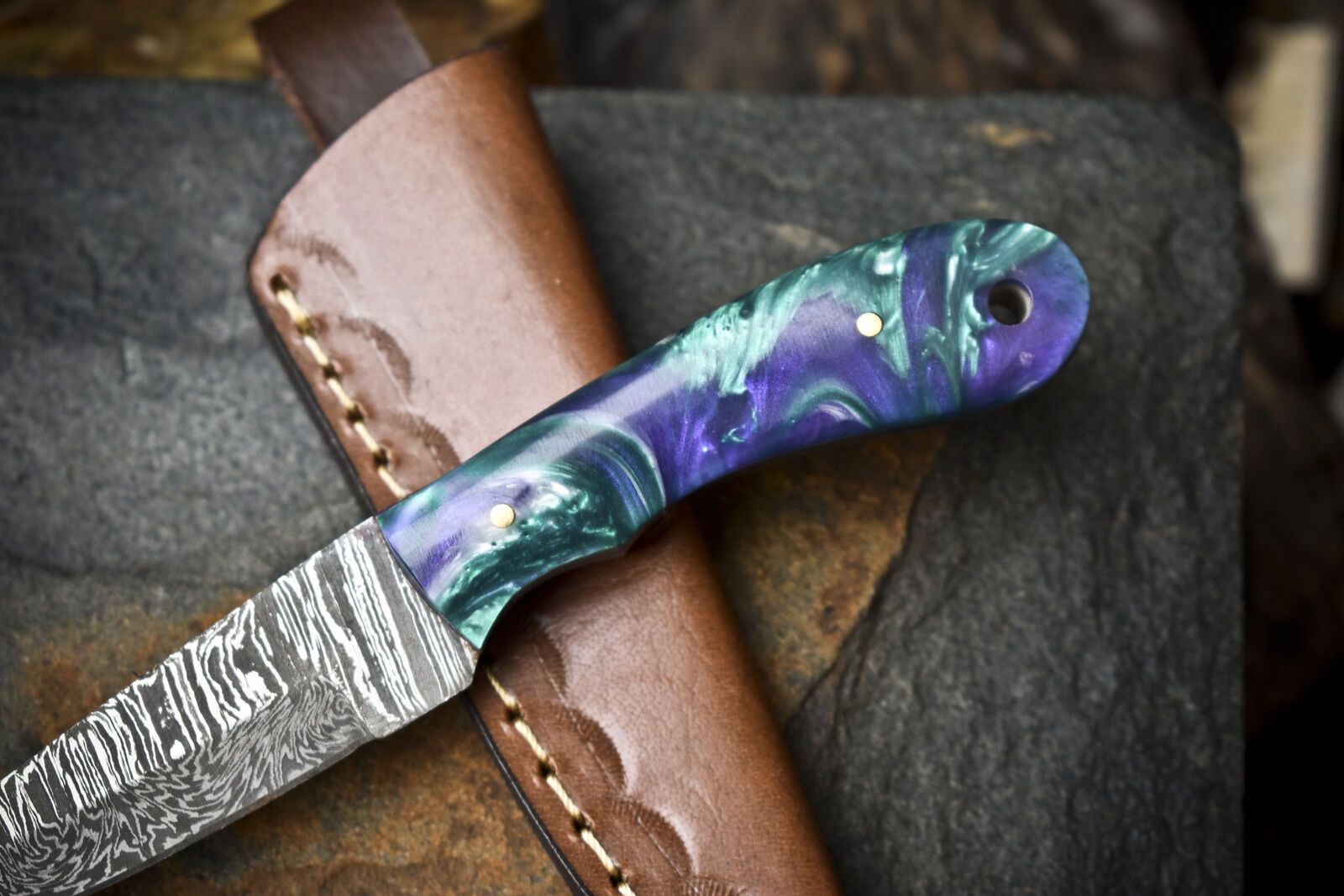 A hand-tooled leather sheath is included, offering secure protection and convenient carry. Built for those who value design and function equally, this Damascus acid etched fixed skinner knife is a standout piece among hunting and outdoor blades.