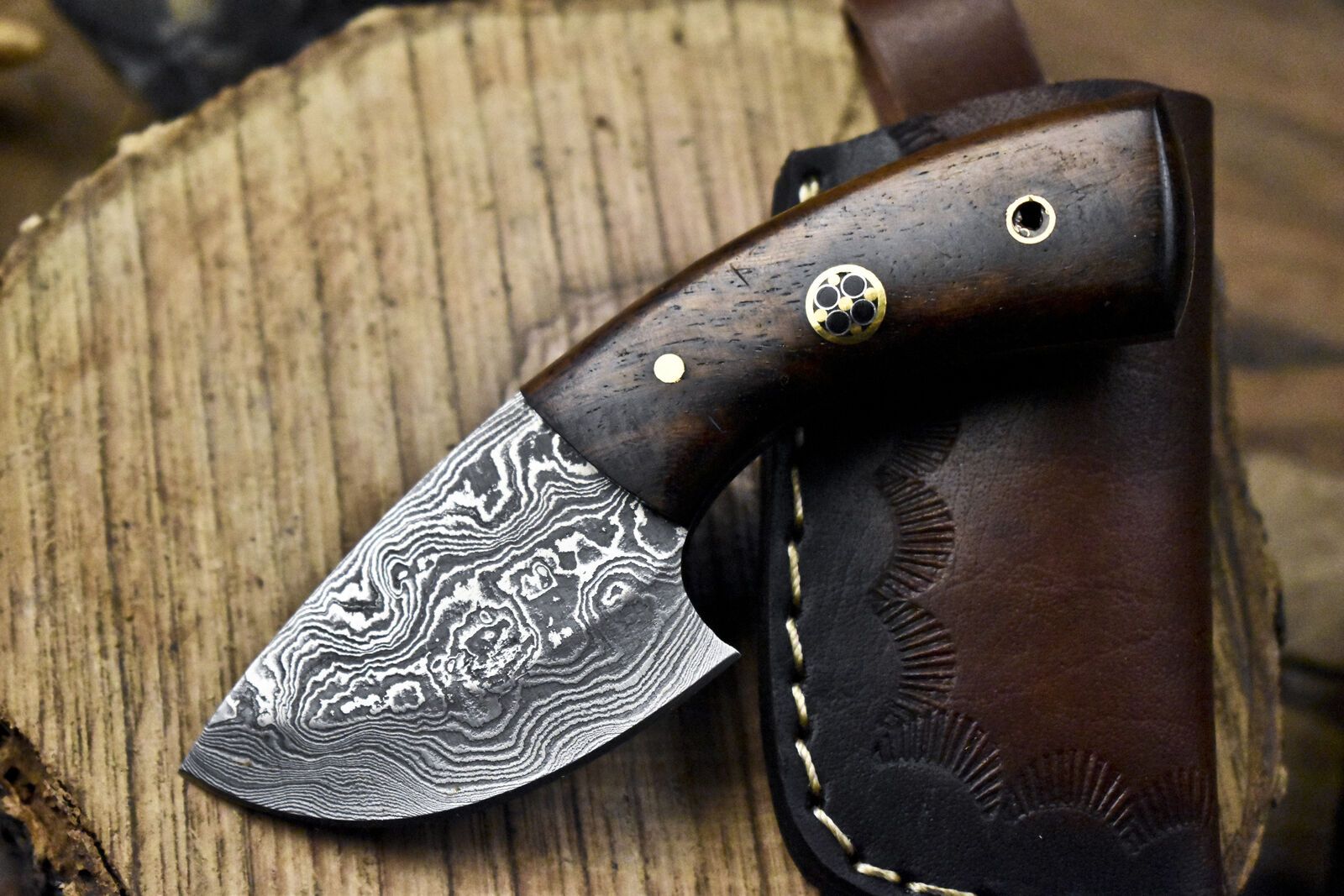 This compact yet powerful custom skinner knife is expertly crafted with a bold twist Damascus blade and a polished walnut wood handle, making it a perfect blend of function and collectible artistry. Measuring just 5 inches overall, with a 2-inch blade and 3-inch handle, this miniature knife is ideal for precision work or decorative display.