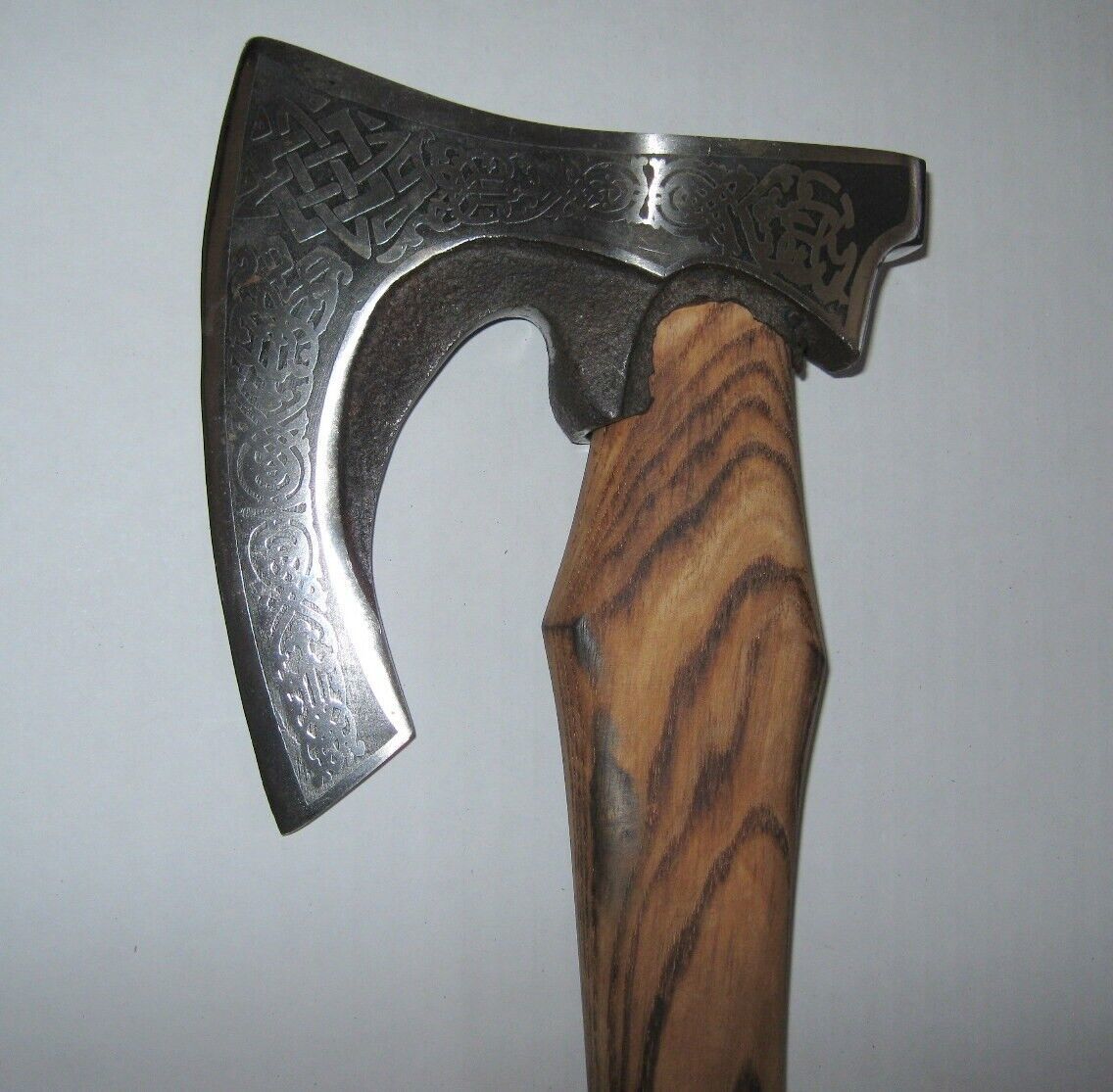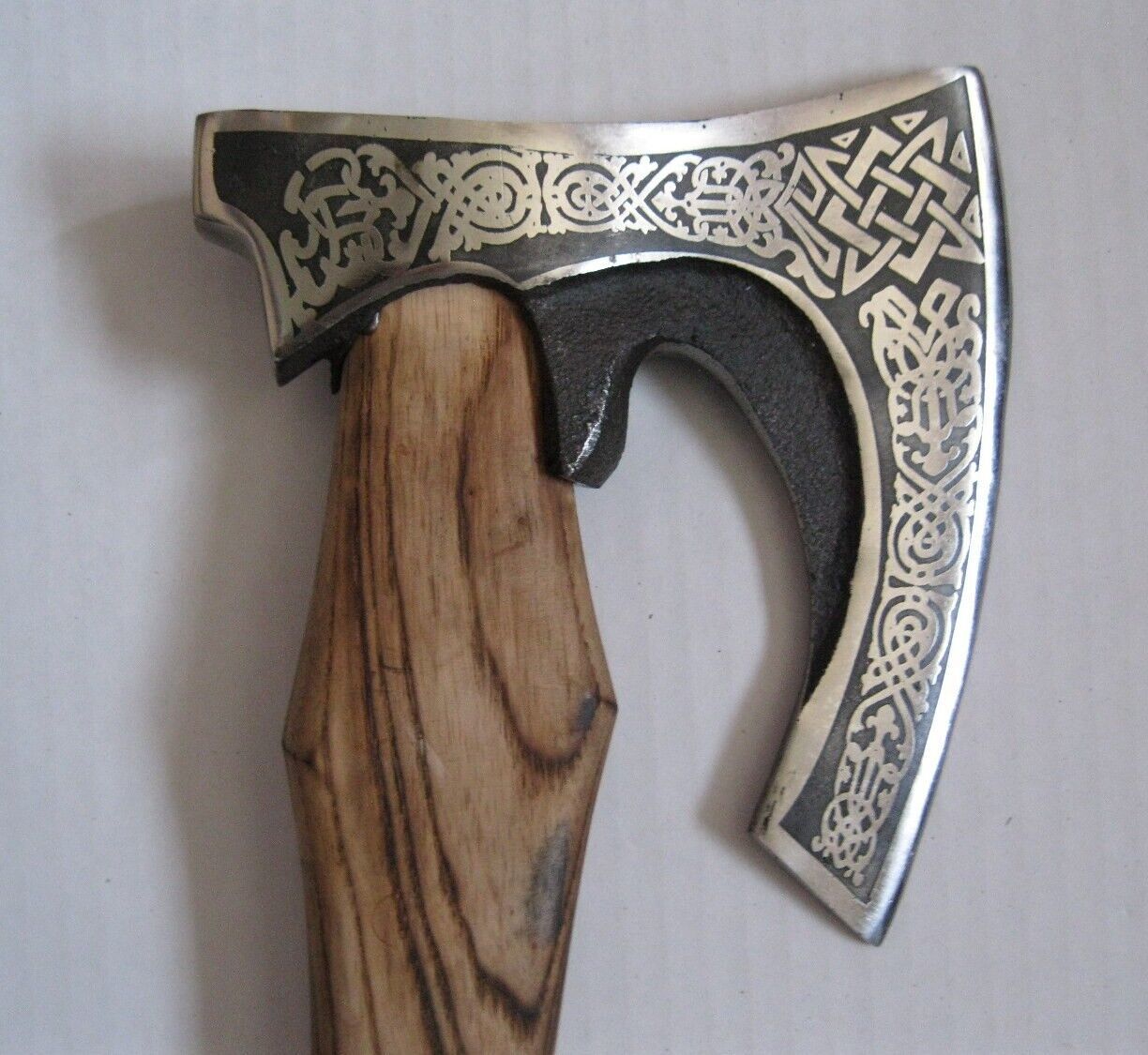 This new Viking battle axe is a hand-forged masterpiece crafted from premium carbon steel, built for strength, balance, and authenticity. Measuring an impressive 20 inches in overall length, this axe is ideal for reenactments, medieval displays, or as a reliable outdoor companion. The 6-inch cutting edge ensures powerful strikes, while the durable carbon steel construction provides excellent hardness and long-lasting sharpness, making it both functional and historically inspired.