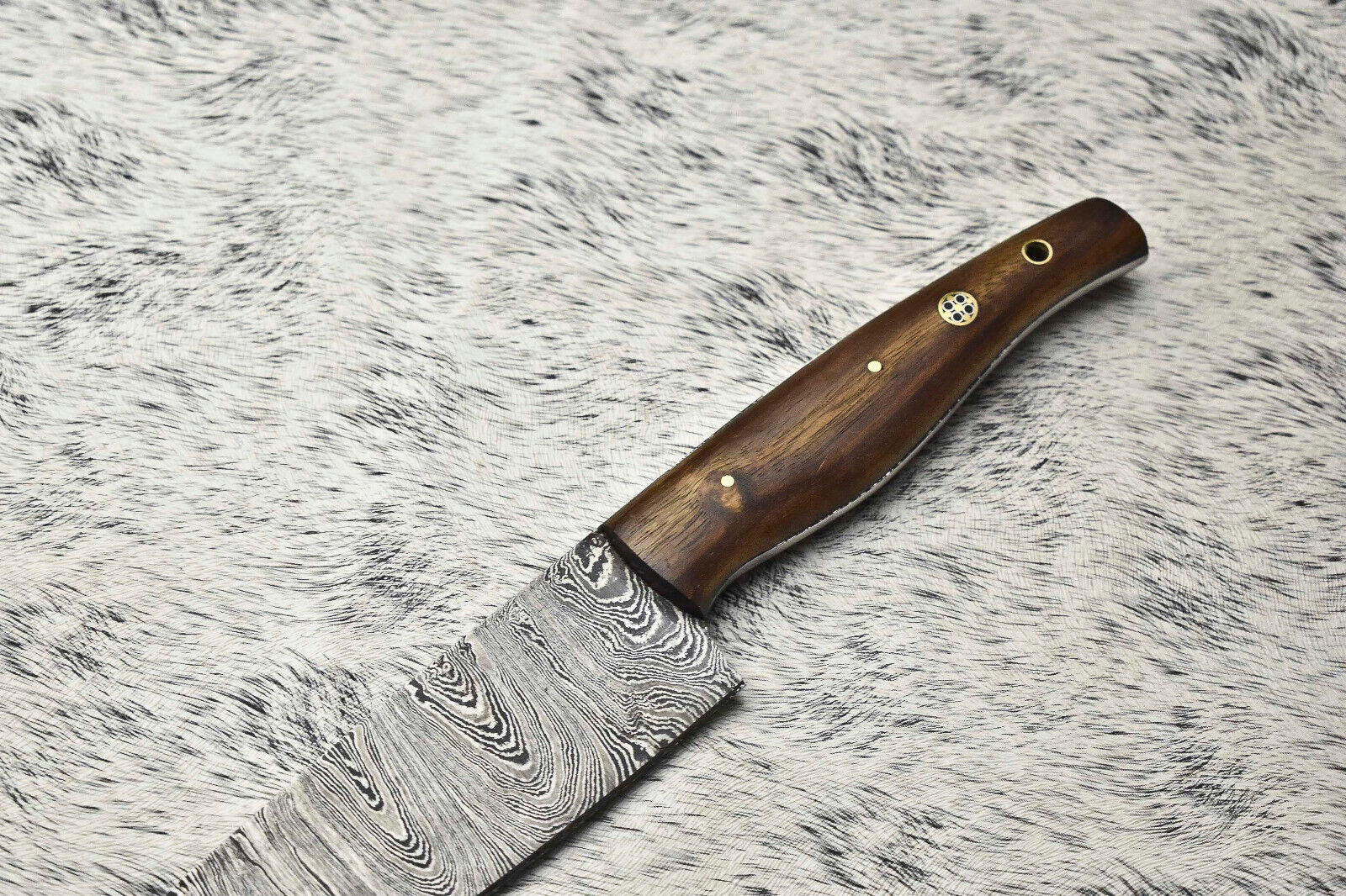 This 12.0" full tang kitchen chef knife is meticulously handmade using authentic Damascus steel, crafted from 384 layers of 1095HC and 15N20 nickel carbon steel. The blade is oil tempered to a hardness of 58-60 HRC and sharpened precisely at a 20-degree angle for exceptional cutting performance. Our Damascus steel is created by repeatedly heating, folding, and forging the steel bars to develop the unique layered pattern. The blade is then acid-etched, which reveals the stunning nickel satin color and the contrasting blackish-gray high carbon layers, showcasing the distinct Damascus pattern. High polishing of the handle removes the acid etch for a smooth finish, while the blade edge retains a satin finish after sharpening. The knife you see in the photos is exactly what you will receive. All knives are 100% handmade with no CNC machining involved, ensuring true craftsmanship and quality.