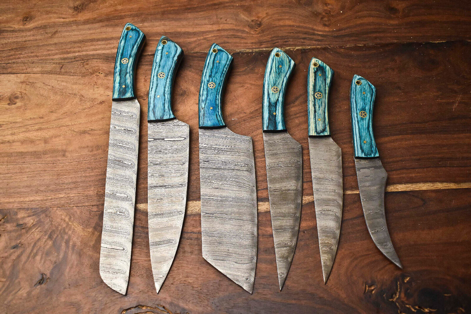 Elevate your kitchen with this premium 6-piece set of handmade Damascus steel chef knives, each crafted with precision and care. Our Damascus steel is authentic, not just acid-etched, made from a combination of 1095HC and 15N20 nickel carbon. Each bar is heated, folded repeatedly, and forged into 384 layers to create a blade that is not only visually stunning but incredibly durable. The blades are then acid-treated, which turns the nickel a satin color and the high-carbon steel a dark gray, revealing the intricate layered patterns. Every knife is hand-polished, giving the blade a sharp, satin finish while the handles are polished for a smooth, comfortable grip. This complete set comes with a leather bag for safe storage and portability. Each knife is 100% handmade, unique, and free from CNC machining, ensuring you receive a one-of-a-kind culinary masterpiece.
