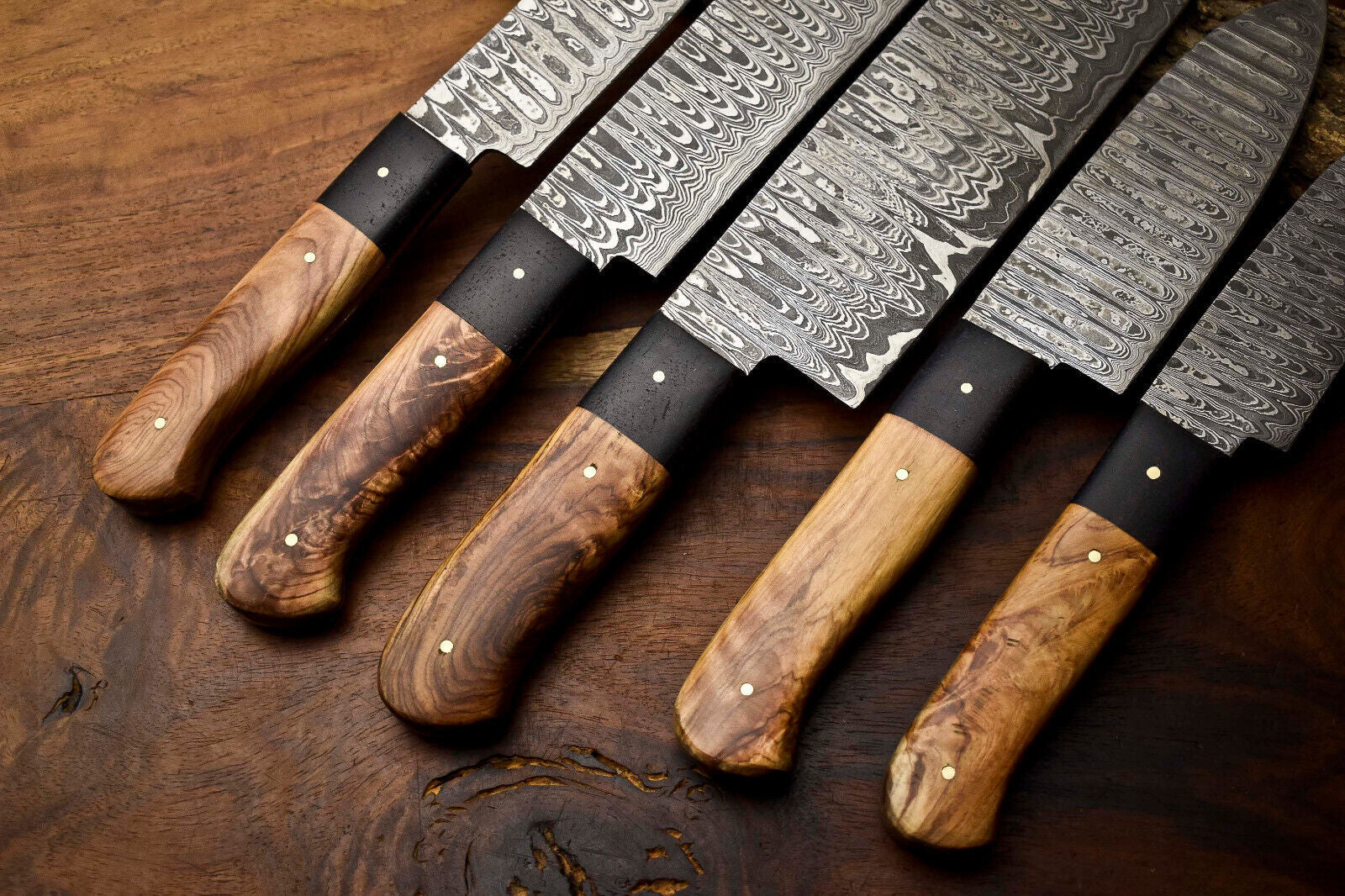Premium Custom Set of 5 Handmade Hammered Damascus Steel Chef Knives – 384 Layer Forged Blades