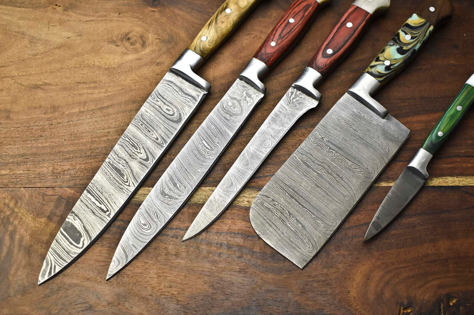 Stunning Custom Lot Of 5 Handmade Hammered Damascus Steel Blade Chef Set Knife.