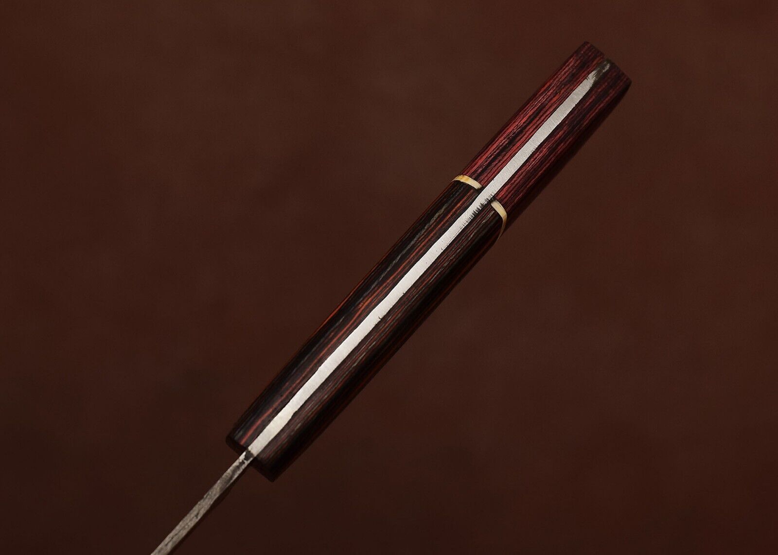 The ergonomic 5-inch Pakka Wood handle with a wood bolster provides a secure and comfortable grip, making it easy to handle during long cooking sessions, hunting, camping, or survival situations. Its full tang construction enhances balance and strength, making this knife a reliable choice for chefs, hunters, and collectors.