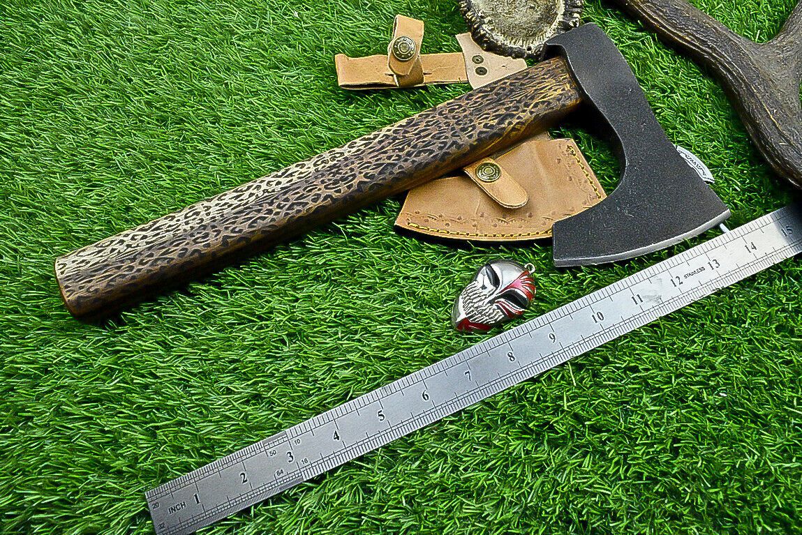 This Premium Hand-Forged Viking Tomahawk Axe is a true masterpiece of craftsmanship and functionality. Handcrafted from high-quality carbon steel, the blade is razor-sharp, durable, and designed for both practical use and display. The axe features a classic bearded design, providing a wider cutting edge while maintaining optimal balance. The solid rosewood handle ensures a comfortable and secure grip, making it ideal for outdoor activities such as bushcraft, camping, hunting, or tactical use. Each axe comes with a premium, hand-crafted leather sheath for safe storage and transport. With an overall length of approximately 14 inches, this Viking-inspired tomahawk combines historical aesthetics with modern functionality. Every piece is hand-forged to guarantee authenticity and quality. Proper care, including wiping moisture off the blade and applying oil after use, will ensure long-lasting performance.
