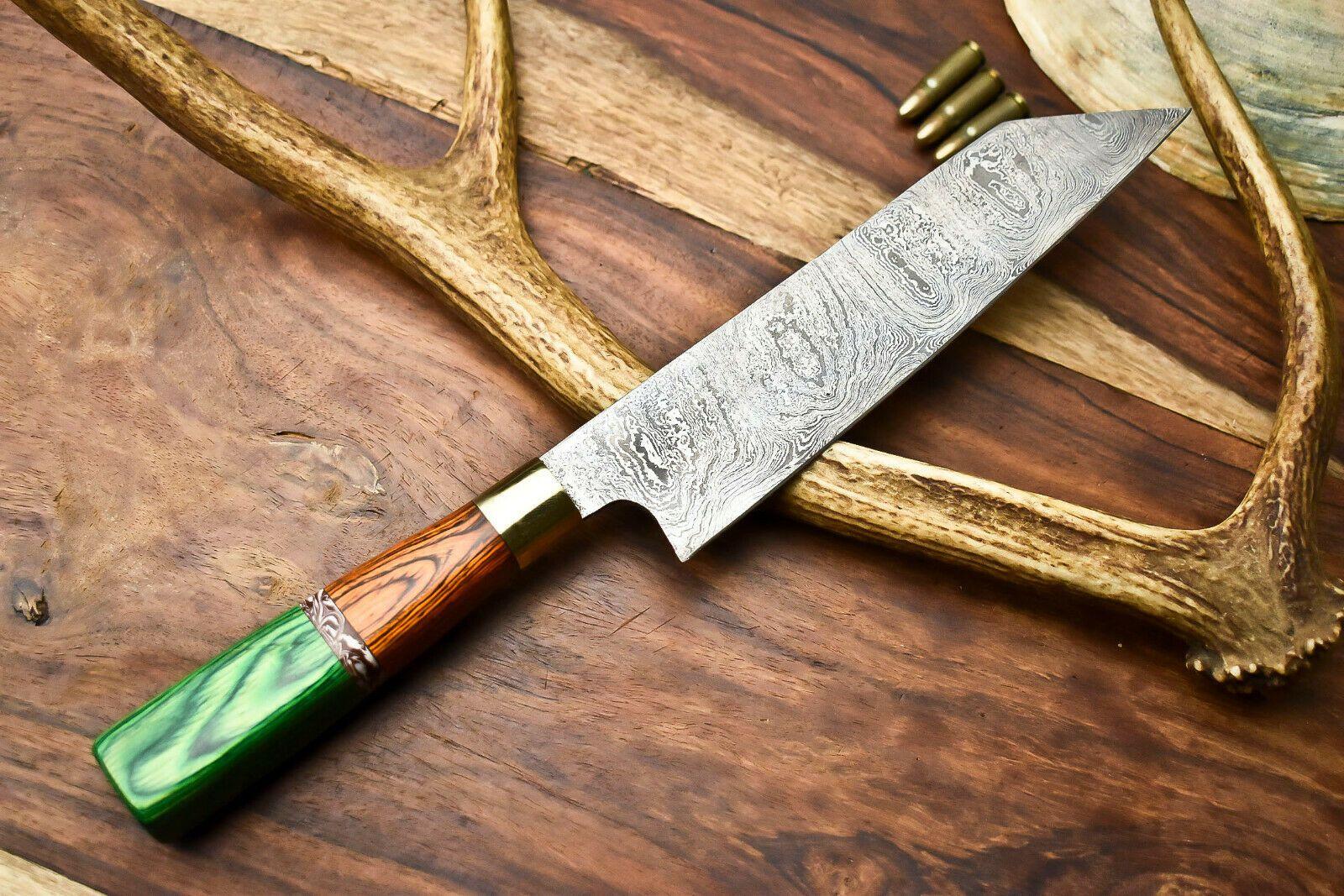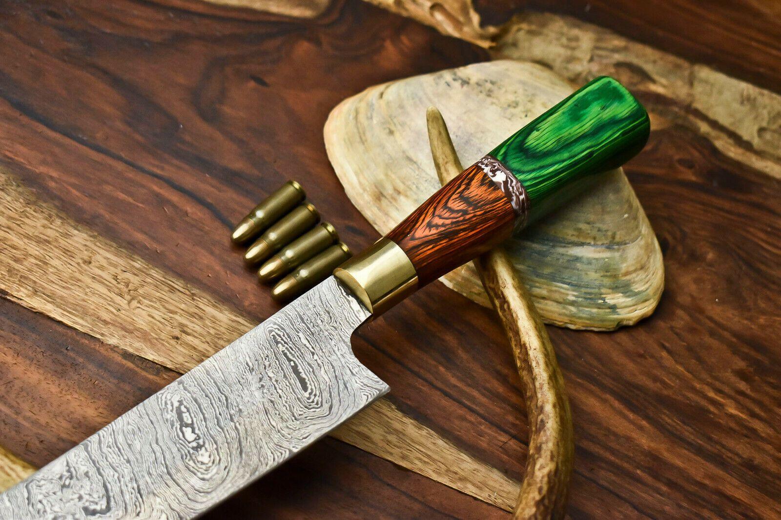 Experience the perfect blend of artistry and functionality with this hand made Damascus steel chef knife featuring a beautiful hard wood handle. Measuring 13 inches in overall length, with an 8-inch blade and 5-inch handle, this knife is oil-tempered to 58-60 HRC and sharpened at a precise 20-degree angle for long-lasting edge retention. Each knife is 100% handmade, ensuring that no two pieces are exactly alike, making it a unique addition to any kitchen or hunting collection.
