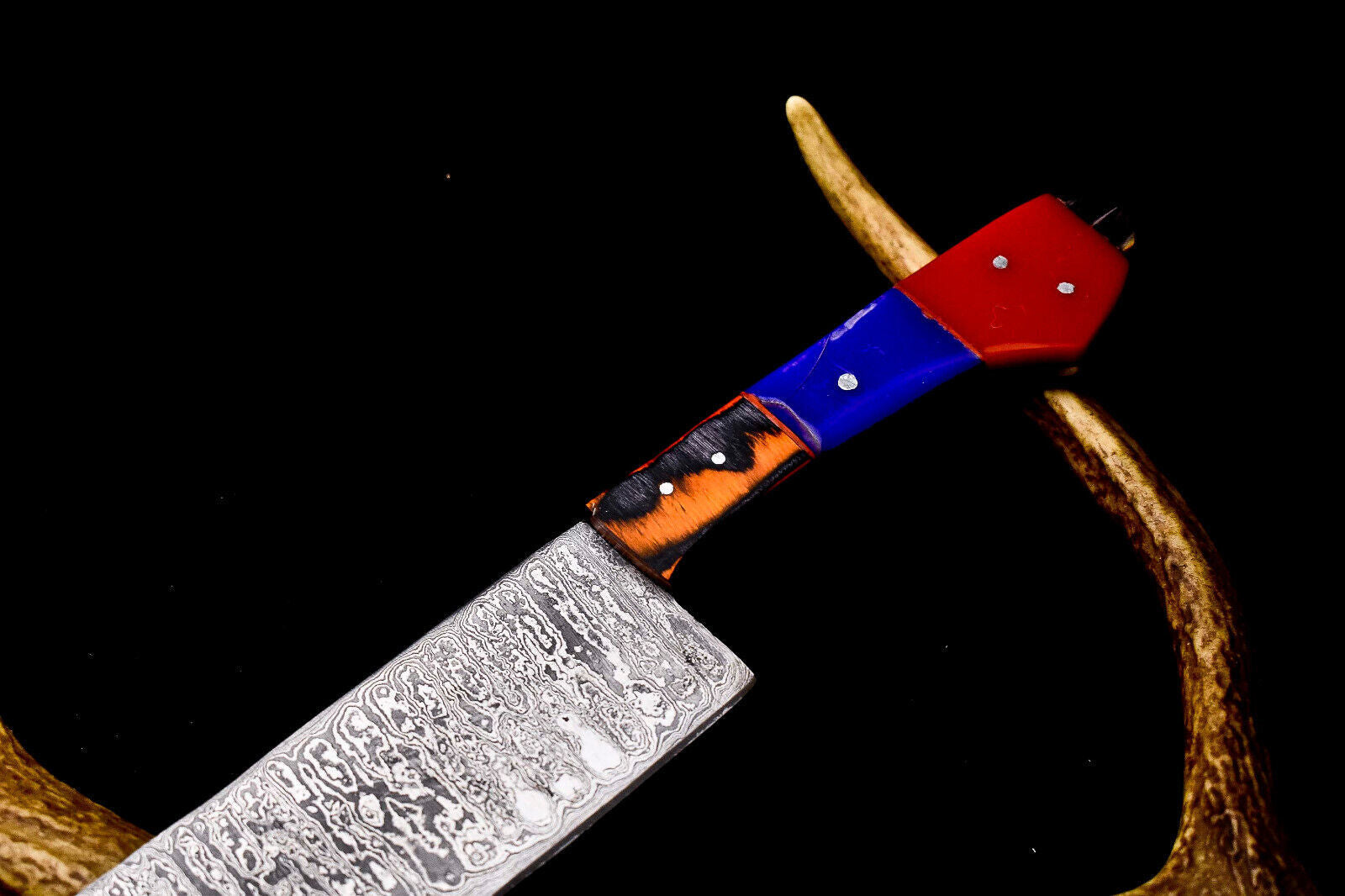 This 12.0" Handmade Damascus Steel Blade Kitchen Chef Full Tang Knife is meticulously crafted to provide both beauty and functionality. Our Damascus steel is made using a real forging process, not just acid etching. We combine 1095HC and 15N20 nickel carbon steel, heat them together, and fold repeatedly to create 384 layers. The blade is then acid-treated to reveal the striking satin nickel and dark high-carbon contrast that highlights the Damascus pattern. Each knife is carefully polished, and the handle is finished to perfection, ensuring a secure grip and a razor-sharp edge. Every knife is 100% handmade, with unique characteristics that make it truly one-of-a-kind. Ideal for professional chefs, home kitchens, or as a collectible piece for knife enthusiasts.