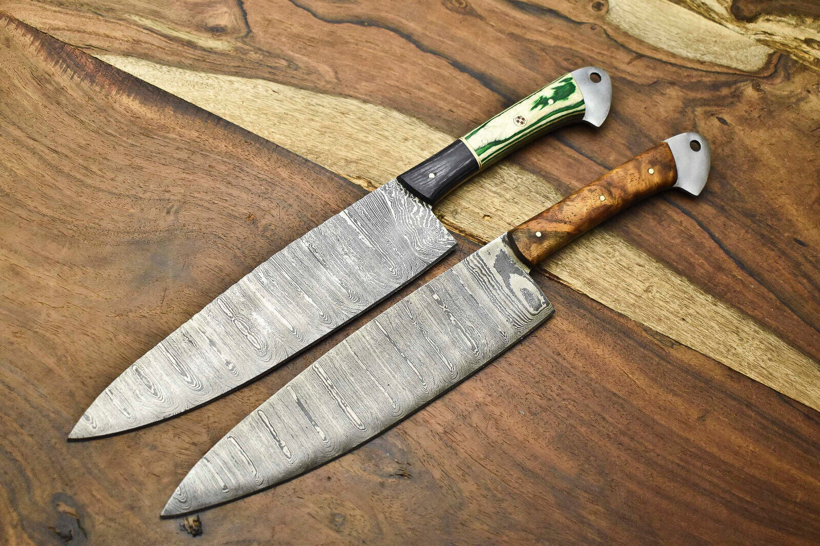 Receive exactly what is shown in the photos with this Lot of 2 Handmade Damascus Steel Full Tang Chef Knives from Cutlery Salvation. Each knife is crafted from genuine Damascus steel, a combination of 1095HC high carbon steel and 15N20 nickel steel, folded repeatedly to create 384 durable layers. The acid burn process reveals the beautiful contrast between satin-toned nickel and blackish-gray high carbon steel, showcasing the intricate Damascus pattern. Handles are carefully high-polished, and blades are sharpened to perfection, transforming the acid-burned edges into a smooth satin finish. These full tang knives are perfect for professional chefs or home cooking enthusiasts, combining precision, durability, and artisan craftsmanship in every cut. All knives are 100% handmade, ensuring exceptional quality and performance.