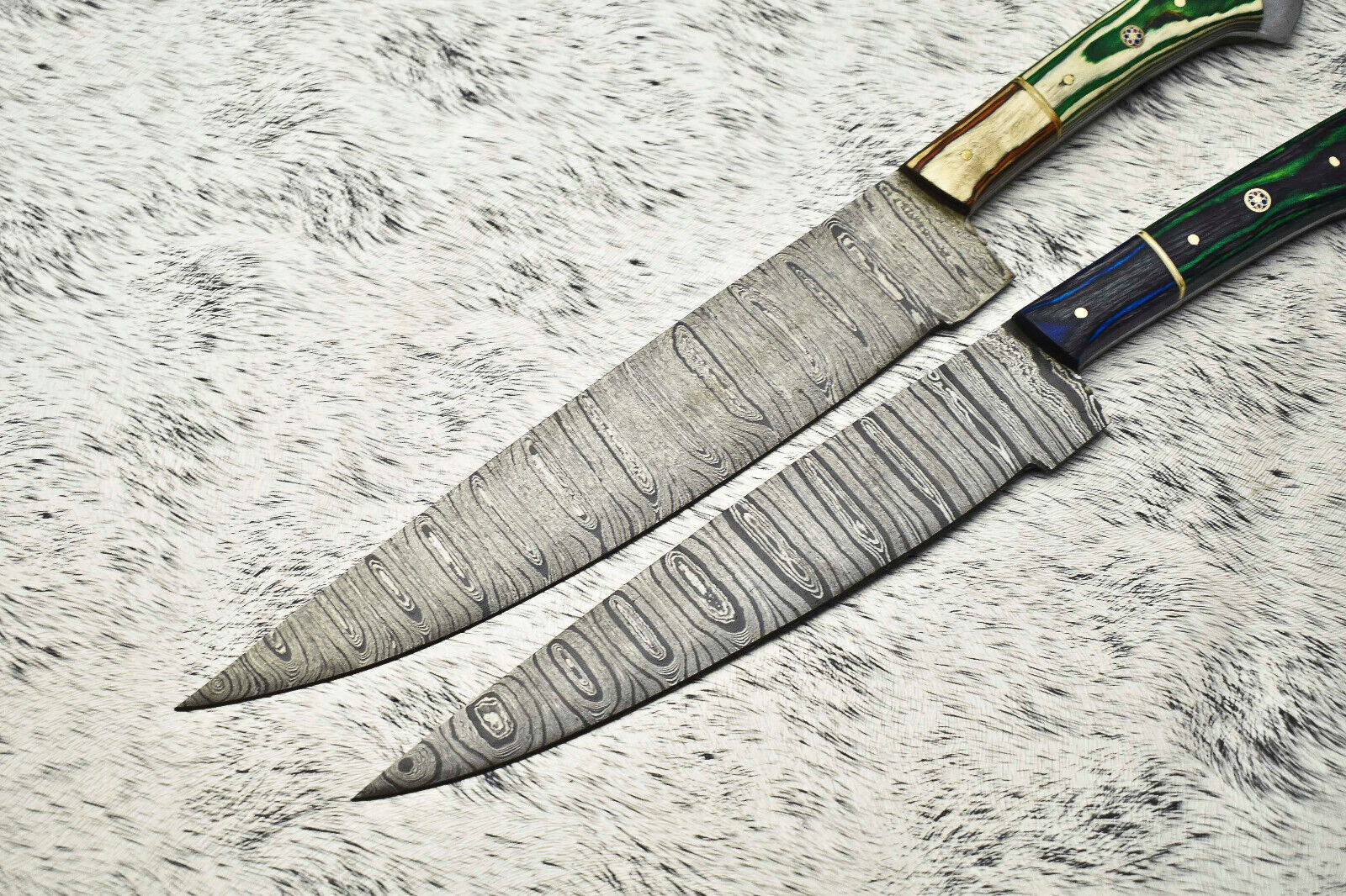 Elevate your kitchen with this Lot of 2 Handmade Damascus Steel Full Tang Chef Knives. Each knife is meticulously crafted from genuine Damascus steel, combining 1095HC high carbon steel and 15N20 nickel steel, folded repeatedly to create 384 strong, durable layers. The acid burn process highlights the contrasting colors—the satin-toned nickel and blackish-gray high carbon steel—showcasing the intricate Damascus pattern. Every blade is acid-etched to reveal these layers, while high-polishing the handles and sharpening the edges ensures both beauty and functionality. These full tang knives are perfect for professional chefs and home cooking enthusiasts, combining precision, durability, and artisan craftsmanship in every cut.
