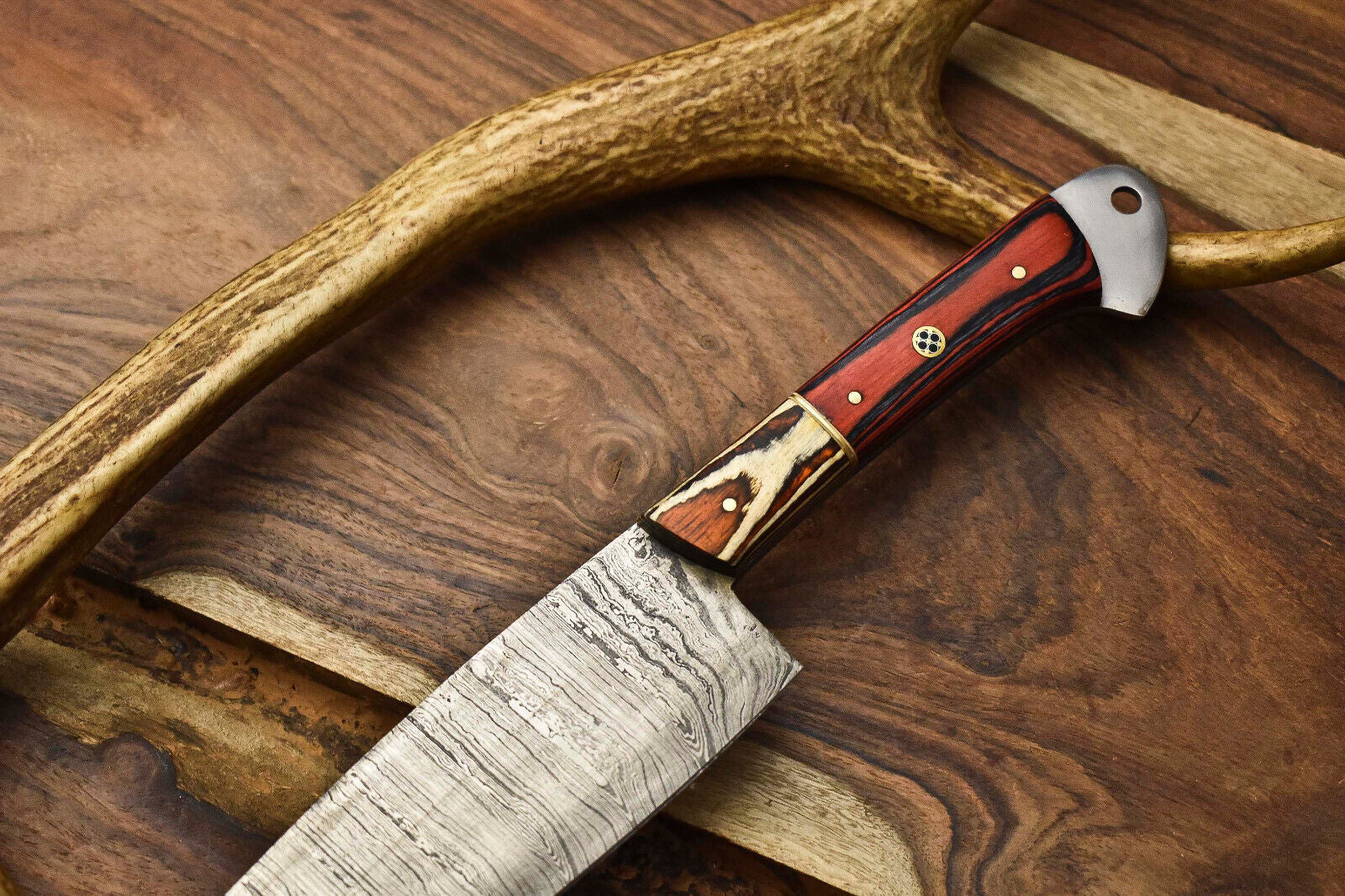 The 12.0" Handmade Damascus Blade Kitchen Full Tang Chef Knife is a precision-crafted culinary tool designed for professional chefs and cooking enthusiasts. Measuring 12 inches in overall length, this knife is oil tempered to a hardness of 58–60 HRC for exceptional strength and edge retention. The razor-sharp blade is honed at a 20-degree angle, providing smooth and effortless cutting. Forged from a blend of 1095HC and 15N20 nickel carbon steels, our real Damascus is created by folding the heated metal 384 times, producing unique layered patterns. After forging, the blade is acid-etched, turning the nickel a satin color while the high-carbon steel becomes a deep blackish-gray, revealing the striking Damascus pattern. The handle is high polished for a smooth, comfortable grip, while the sharpened satin-finished edge ensures excellent performance. This full tang construction offers perfect balance and durability, making it ideal for a variety of kitchen tasks. The knife in the photos is the exact piece you will receive—100% handmade, functional, and built to last.