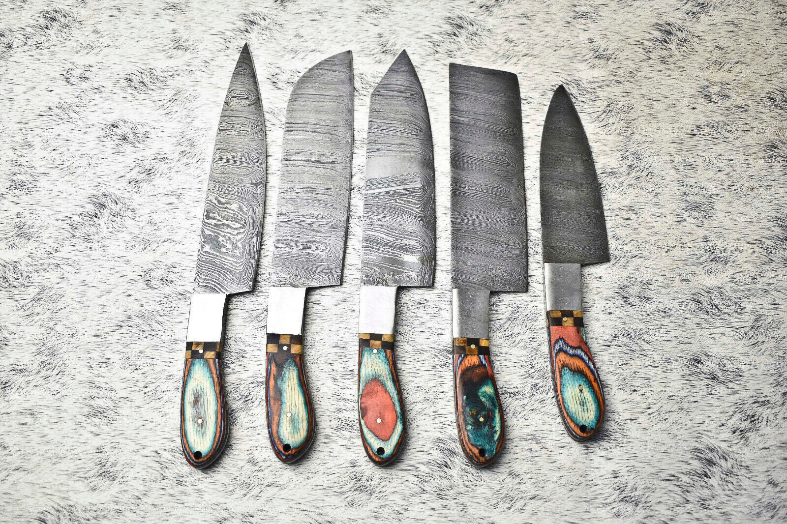 Premium Lot of 5 Handmade Hammered Damascus Steel Chef Knives – Artisan Forged Set