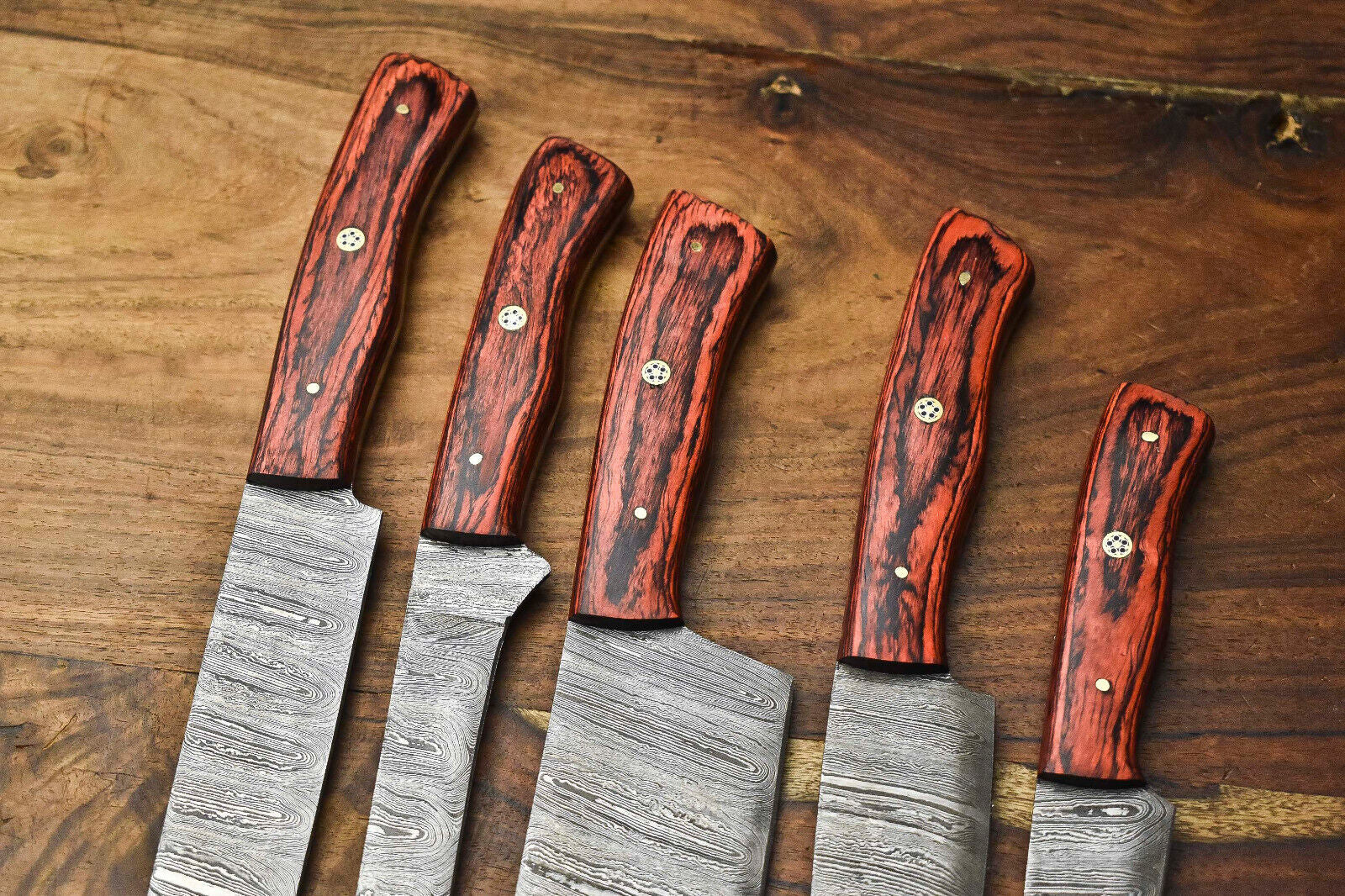 Premium Lot of 5 Handmade Hammered Damascus Steel Chef Knives – Sharp & Durable