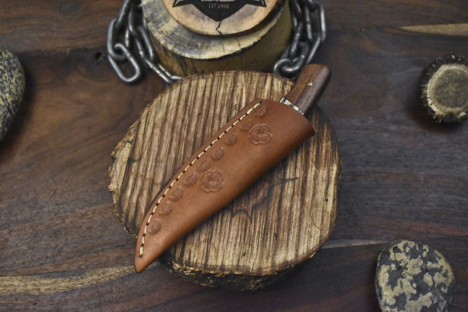 Each knife includes a hand-stitched leather sheath for safe storage and easy carry. Whether you're searching for a dependable damascus skinner hunting knife or a piece to add to your collection, this compact model stands out in craftsmanship and design. A truly unique damascus skinner knife for sale, forged with care and built to perform.