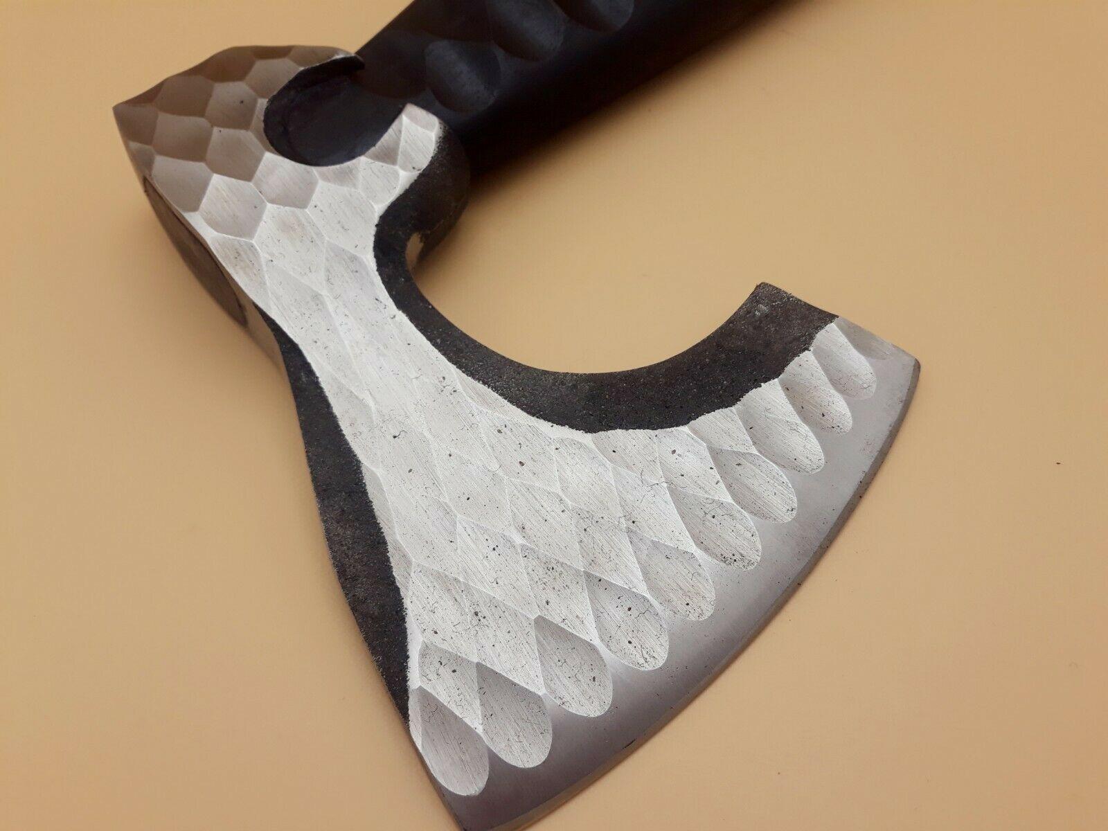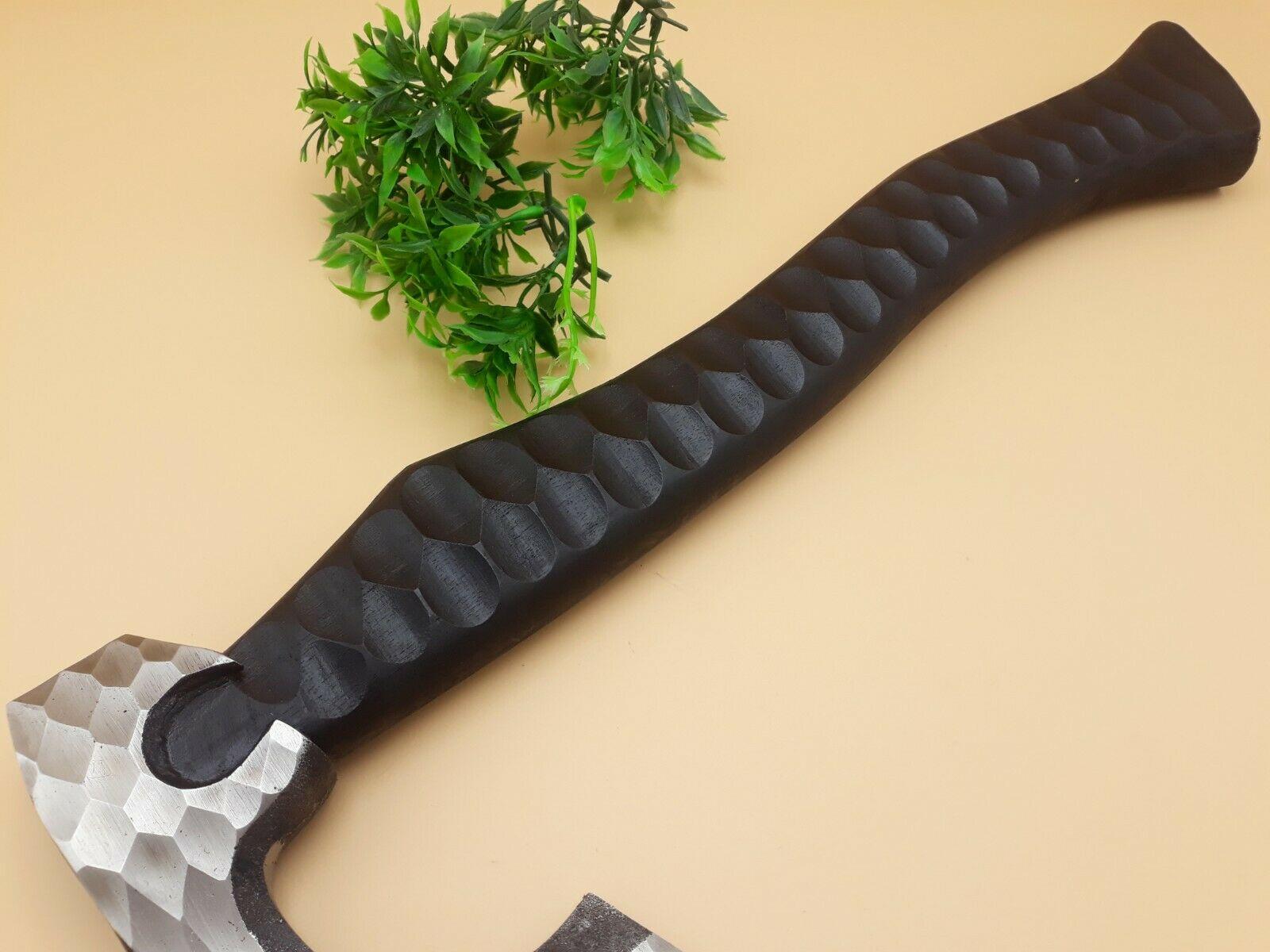 Discover the power and craftsmanship of this rare custom handmade Viking tomahawk, featuring a D2 tool steel blade with precision etching for a truly unique look. Measuring 18 inches in overall length with a 4.6-inch blade, this axe is designed to impress collectors, outdoor enthusiasts, and reenactment fans alike. The 6.5-inch wide Damascus steel blade is forged to a robust 13 mm thickness and hardened to 60 HRC, offering exceptional durability, edge retention, and penetration capability. Each blade undergoes a meticulous process of grinding, buffing, and polishing, resulting in subtle variations that make every axe one-of-a-kind. The handle is crafted from high-quality color wood, accented with decorative rosettes, and carefully secured to ensure both stability and comfort. Included is a premium, hand-tooled leather belt sheath with white top stitching, designed to protect your axe while providing a rugged, long-lasting carry solution. Whether displayed as a centerpiece in a collection or used for tactical or outdoor purposes, this Viking tomahawk embodies centuries of craftsmanship, blending historical inspiration with modern materials. Owning this axe means holding a piece of authentic Viking heritage in your hands, with unmatched quality and detail.