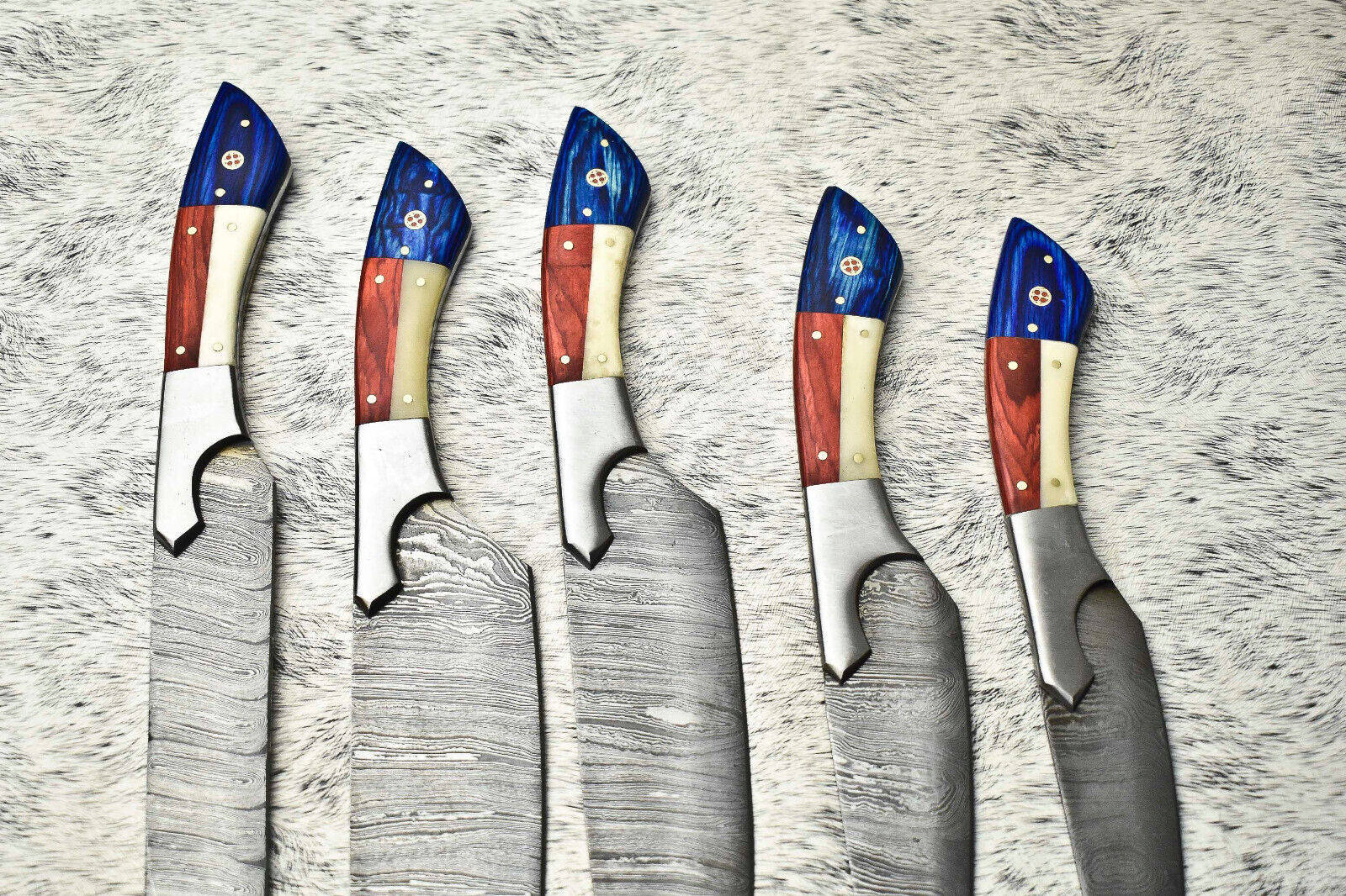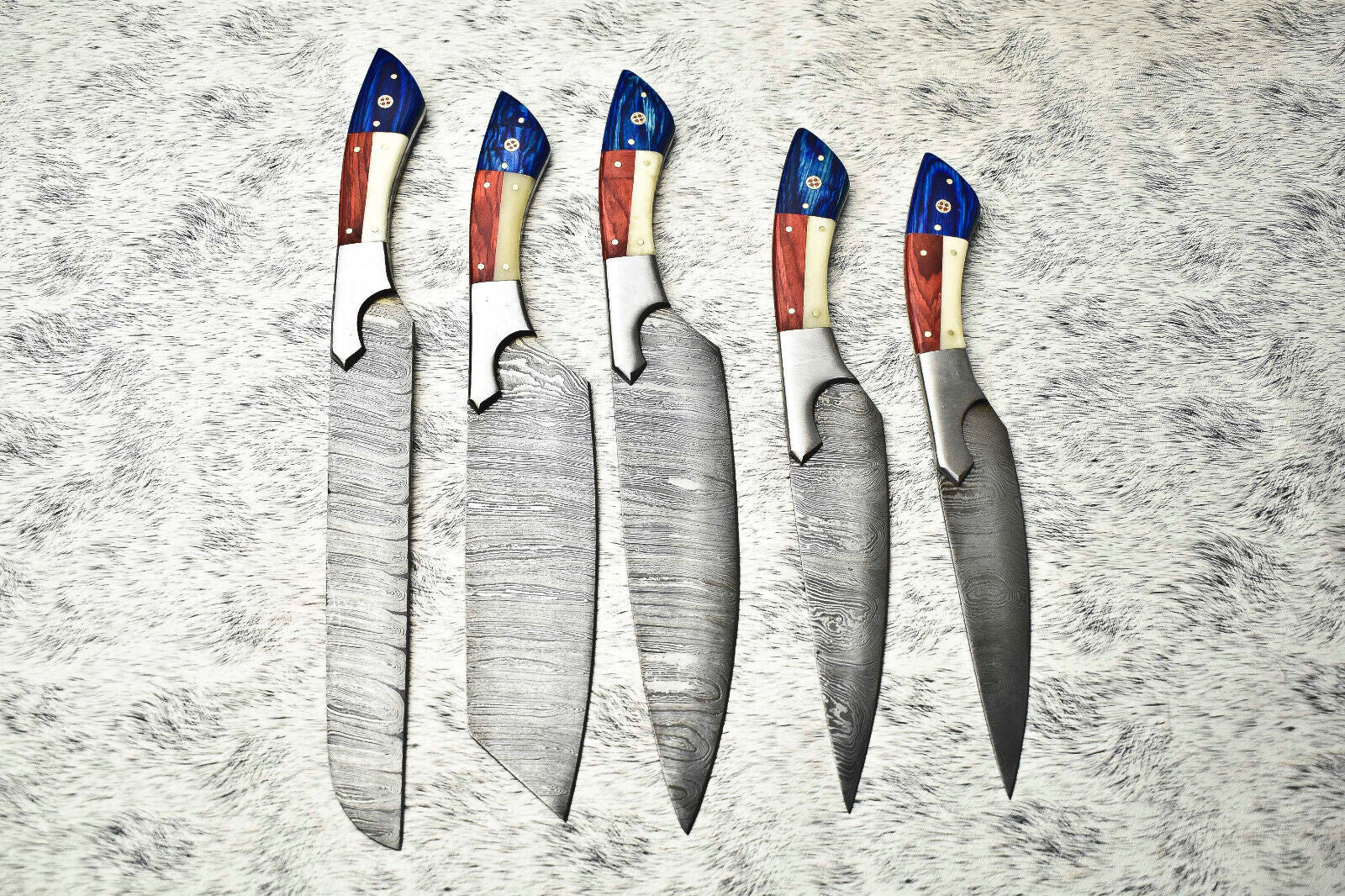 Rare Custom Lot of 5 Handmade Hammered Damascus Steel Blade Chef Knife Set – Oil Tempered 58-60 HRC, Sharpened at 20°