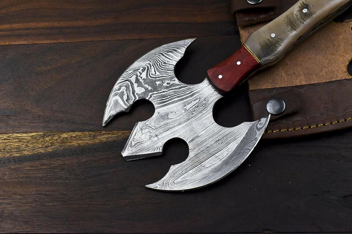 Rare Handmade Damascus Ram’s Horn Hunting Clever Chopper Axe Knife with Leather Sheath