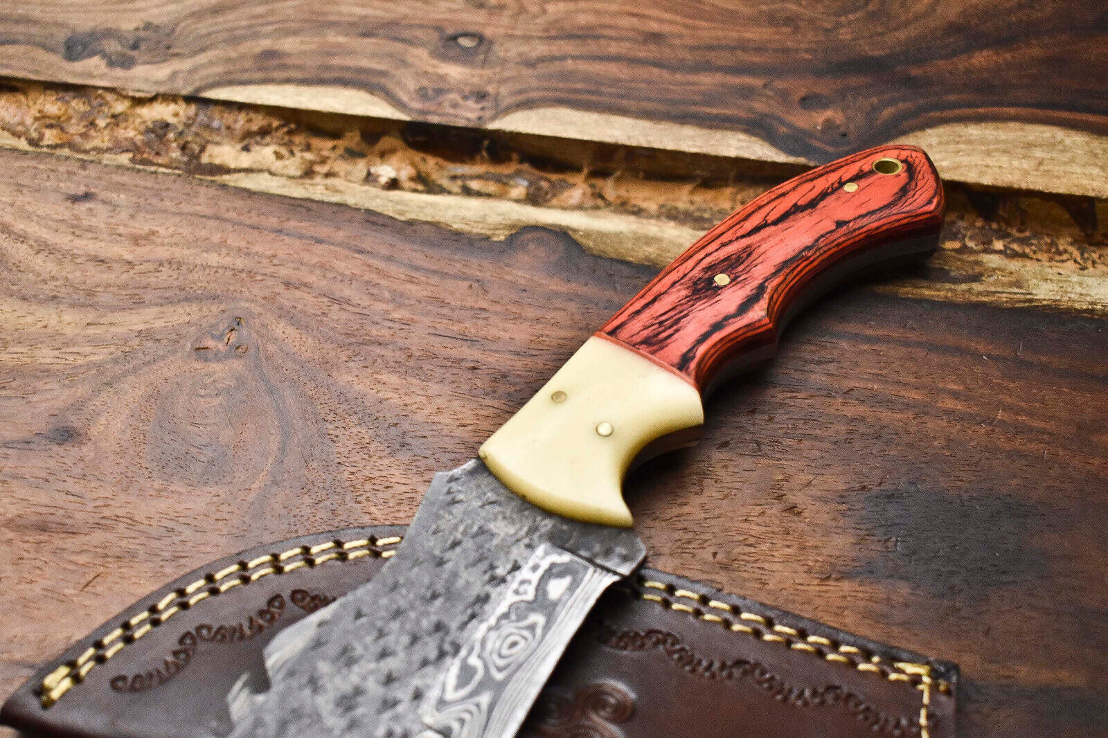 This Rare Handmade Damascus Blade Camping Tracker Full Tang Knife is a premium outdoor tool crafted with unmatched skill and tradition. Made from a unique blend of 1095 high carbon steel and 15N20 nickel steel, the blade is folded repeatedly to form 384 distinct layers, showcasing the true artistry of Damascus steel. Each layer becomes visible after acid etching, where nickel transforms into a satin finish and carbon takes on a deep gray tone, creating a striking wave-like pattern. Unlike cheap acid-etched imitations, this blade represents authentic forged Damascus with real strength and durability.The knife is designed with a full tang construction for maximum balance and toughness, making it dependable for camping, hunting, survival, fishing, and bushcraft. After forging, each blade is polished and hand-sharpened to achieve a razor-sharp edge, while the handle is refined to provide a secure, comfortable grip. A handcrafted cowhide leather sheath is included for safe carry and easy access in the field.Every piece is 100% handmade without CNC machining, ensuring each knife is one-of-a-kind, with unique characteristics that enhance its authenticity and charm. Strong, sharp, and built to last, this Damascus tracker knife is a functional tool as well as a collector’s masterpiece.