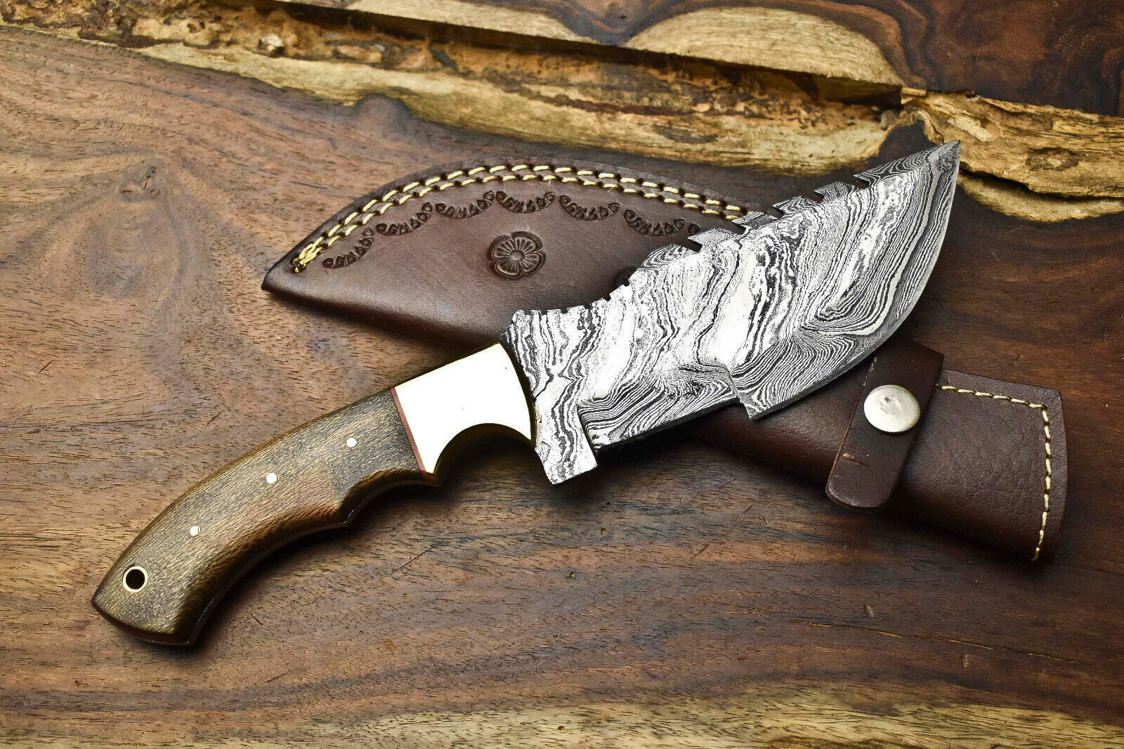 This Rare Handmade Damascus Tracker Knife is built for adventurers, hunters, and collectors who demand both performance and artistry. Crafted by skilled bladesmiths, the knife is forged from a blend of 1095 high carbon steel and 15N20 nickel steel, folded repeatedly to create 384 layers of true Damascus steel. Each layer forms the distinctive wavy patterns Damascus is famous for, revealed through an acid etching process that enhances the natural contrast between the metals.With its full tang construction, this tracker knife offers unmatched durability, balance, and control. The blade is hardened to 58–60 HRC, ensuring long-lasting sharpness and toughness for demanding outdoor use. Whether you’re chopping, skinning, carving, or general bushcrafting, this knife is a reliable companion for camping, hunting, and survival tasks.