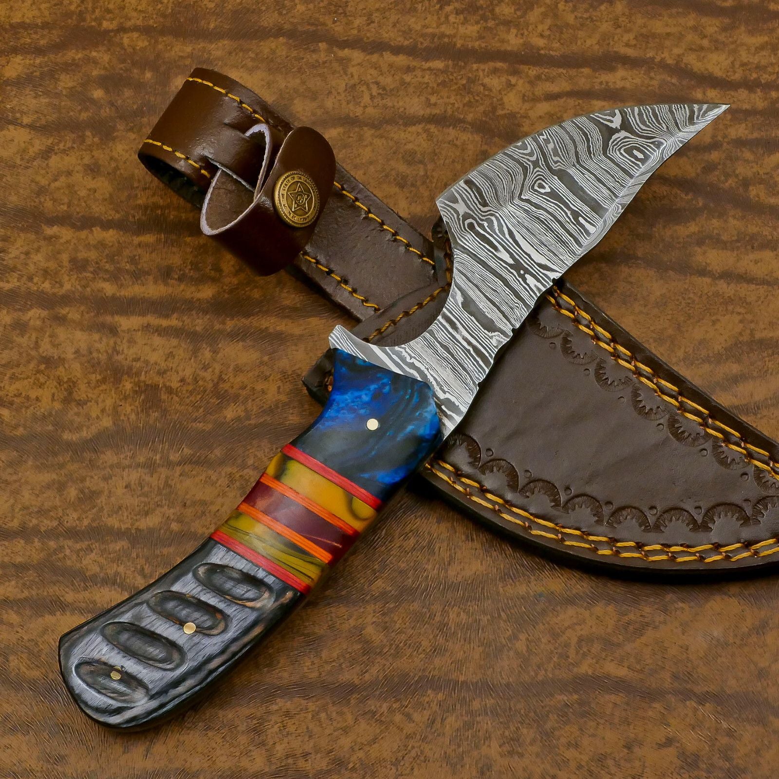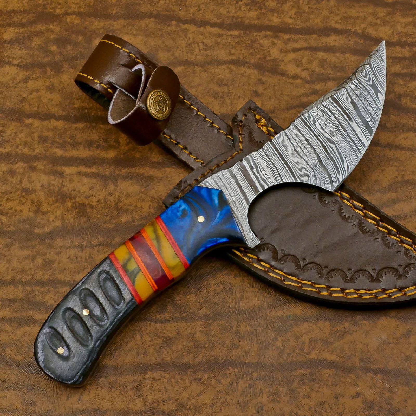 The handle, crafted from a unique blend of resin and wood, offers a comfortable and secure grip, making it ideal for precise skinning tasks. Built with full tang construction, this damascus knife custom handmade fixed blade hunting knife skinner is designed for rugged use in the field without compromising on aesthetics.