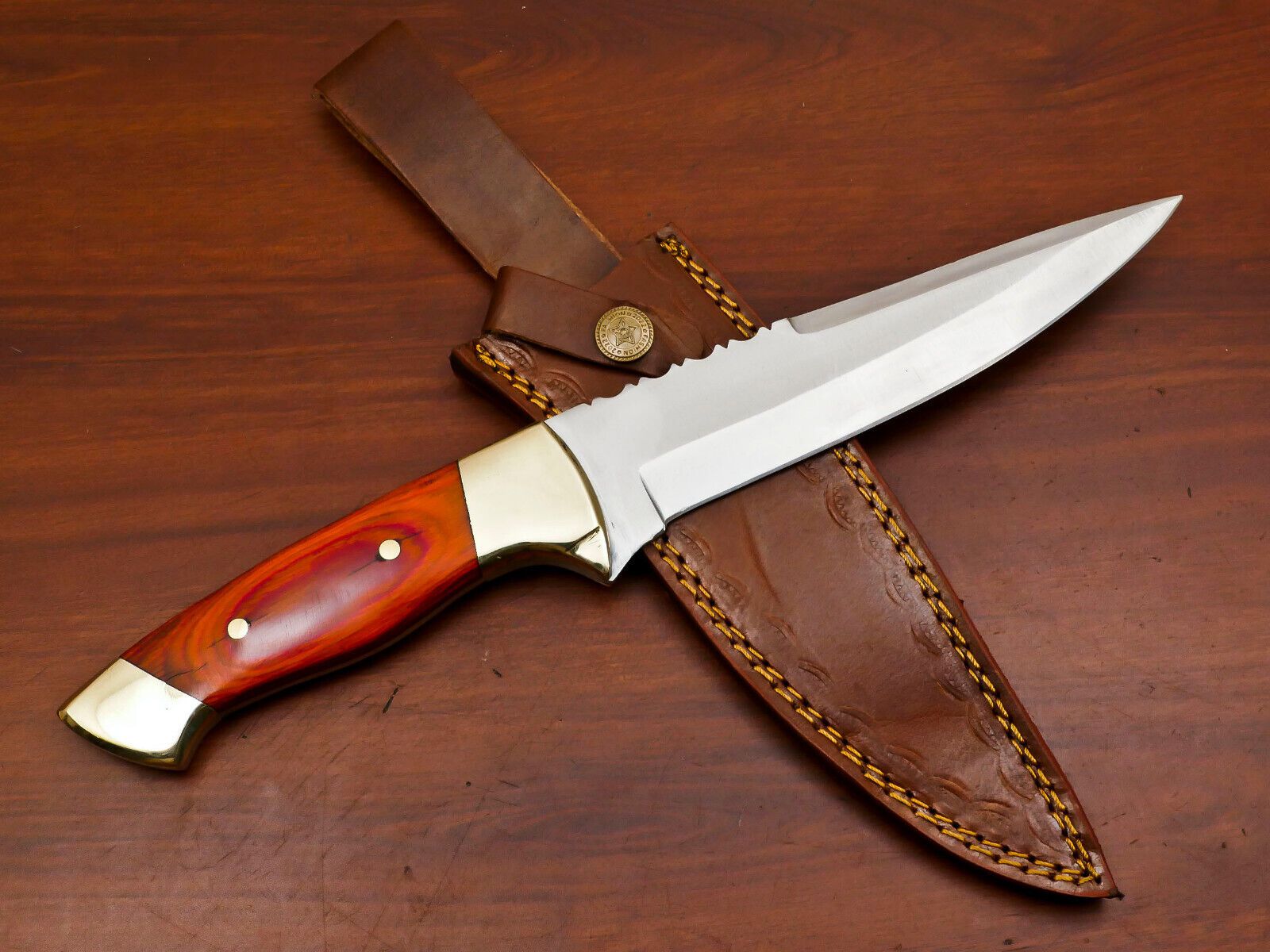 The Sentinel Pro 12-inch D2 steel full tang Bowie hunting knife with brass guard is a premium handcrafted tool built for hunters, campers, survivalists, and collectors who demand reliability and precision. Featuring a high-carbon D2 tool steel blade, this knife provides exceptional hardness, superior edge retention, and excellent wear resistance, making it perfect for chopping, slicing, piercing, and skinning. Its Bowie-style blade combines versatility with a classic rugged look, suitable for both functional use and display.The full tang construction ensures maximum strength, stability, and balance, allowing the knife to tackle heavy-duty tasks with ease. The brass guard adds a touch of elegance while protecting your hand during rigorous use. The ergonomically designed handle offers a secure and comfortable grip, reducing hand fatigue and providing precise control for detailed or forceful cutting. Each Sentinel Pro knife is carefully handcrafted by skilled artisans, ensuring a unique character and artisanal quality that separates it from mass-produced knives. Complete with a custom leather sheath for safe storage and convenient portability, this Bowie hunting knife is ready for immediate outdoor adventures. Durable, reliable, and expertly crafted, the Sentinel Pro 12-inch D2 steel full tang Bowie hunting knife with brass guard is an essential tool for serious outdoor enthusiasts and collectors.