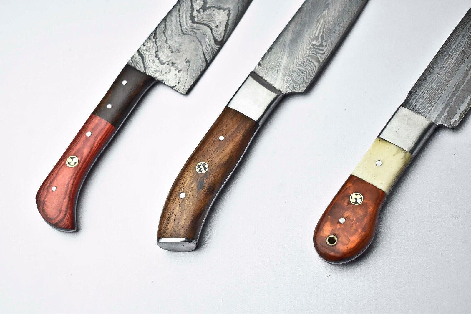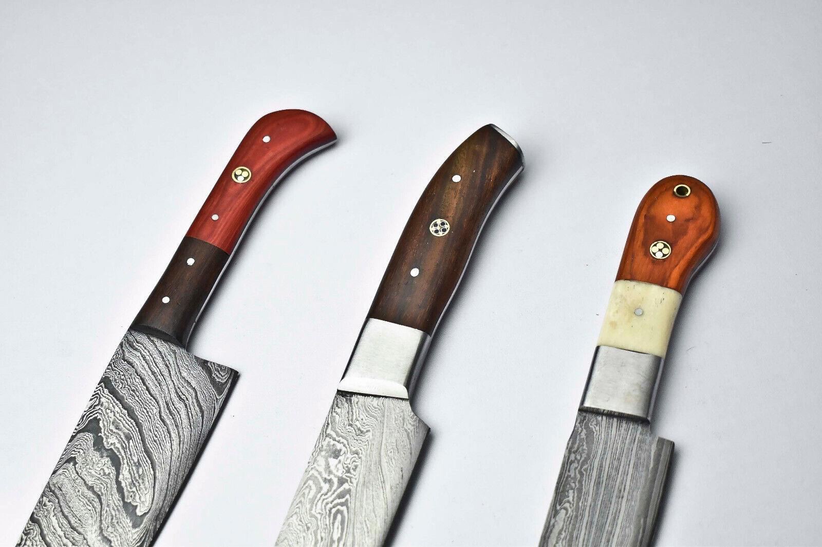 Set of 3 Handmade Damascus Steel Chef Knives – Custom Forged Kitchen Blades